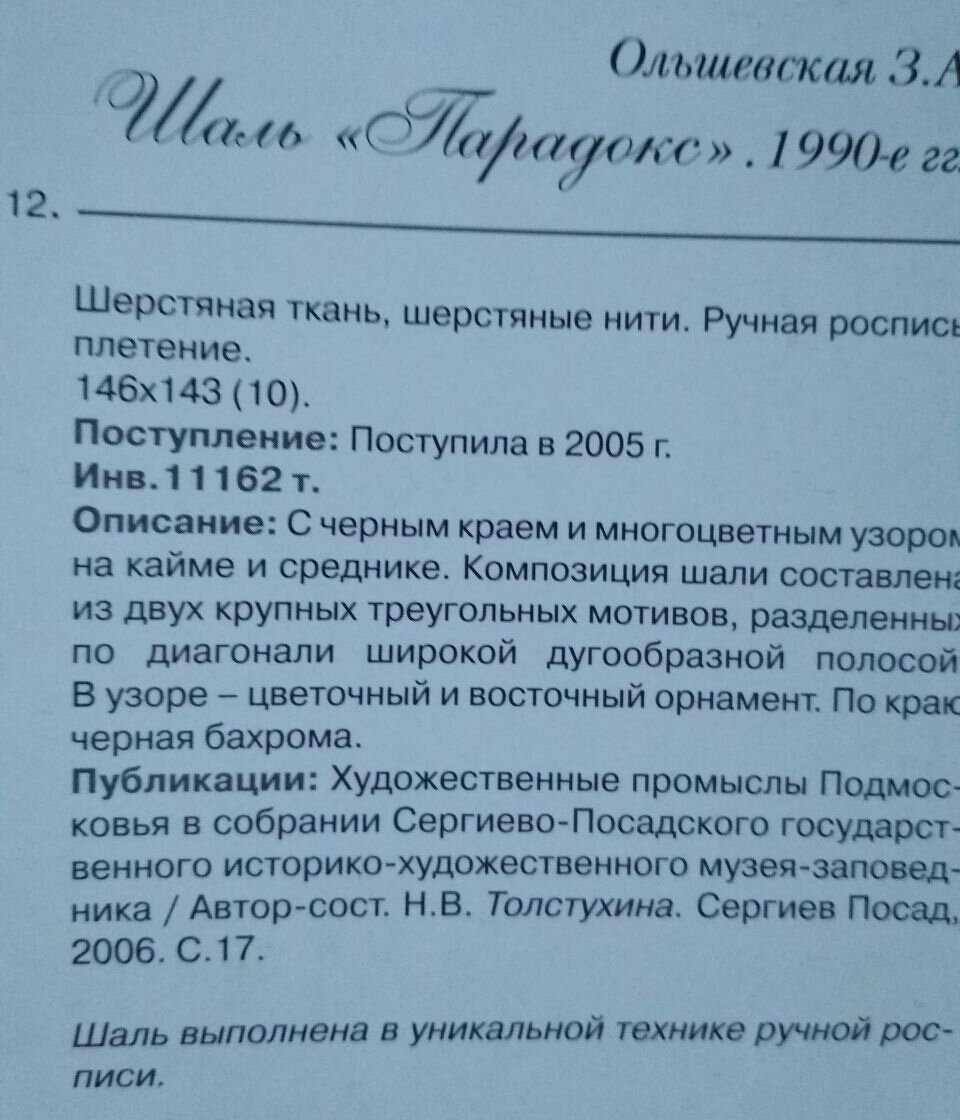 Шаль находится в музее, думаю, что передана самой Златой Александровной (в дар?)