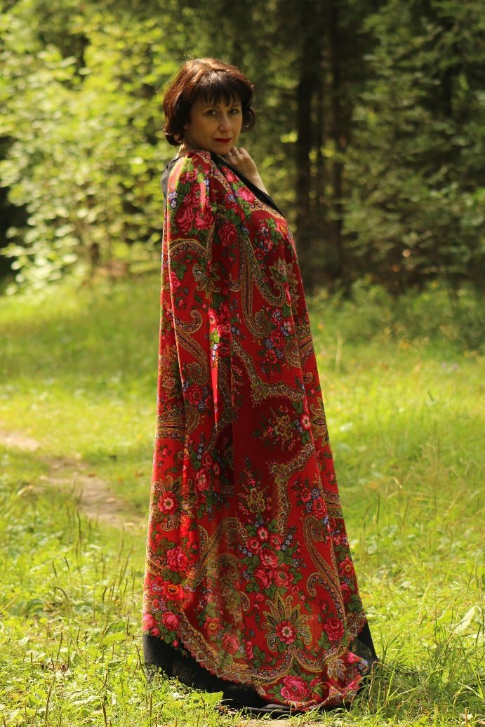 С пылу с жару, без подготовки, распечатала посылку и шаль на плечах. Вот она такая шаль Златы Ольшевской, 'Времена года' Зима, вид 12. Мне очень понравилась и цвет, и ткань мягкая, хорошо драпируется.