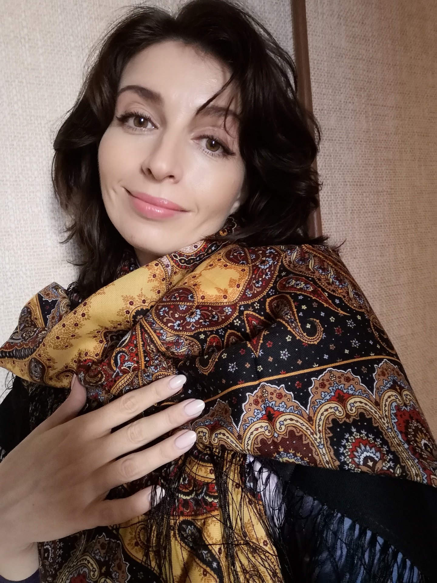 Добро пожаловать в нашу дружную компанию. Здесь тепло, уютно и радужно. Вам очень идут платки у вас внешность очень яркая, вы красавица. Шаль Печатный пряник - шедевр и на вас он великолепен.