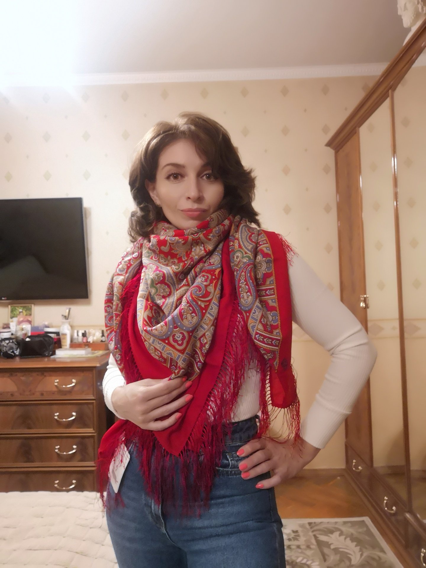 Marisabelle, поздравляю с обновками. Очень, очень идут тебе. С Морозко на голове будешь не Марфушой, а самой настоящей снегурочкой. Я вечером тоже прощеголяла в Волшебным танце. Он прекрасный. У этого платка правильный красный. Не морковный, не уходит в темноту, а как раз что многим идёт. Носи на здоровье и Радуй нас показами!