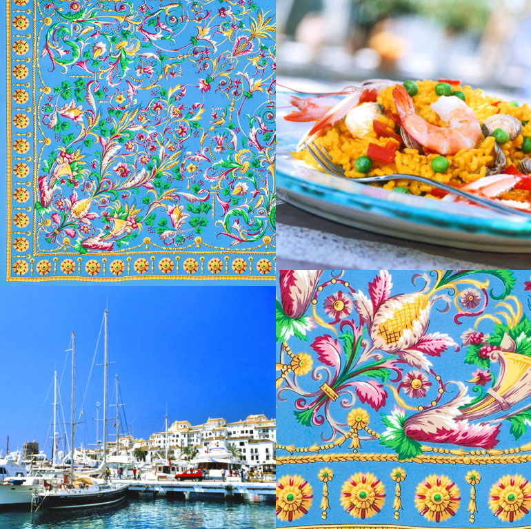 И посмотрите, как созвучен этот бирюзовый с жёлтыми вкраплениями в орнаменте с испанскими пляжными мотивами... А?