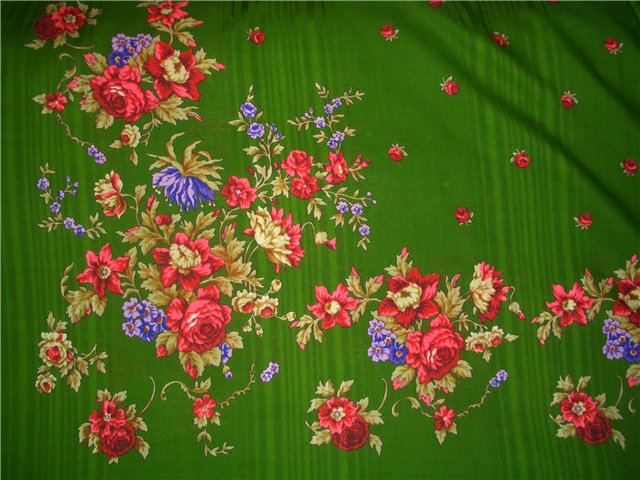 От платка, показанного Mary, отличается, кроме колорита, ещё и тем, что по центру разбросаны не ягодки, а цветочки и двуцветные мячики.