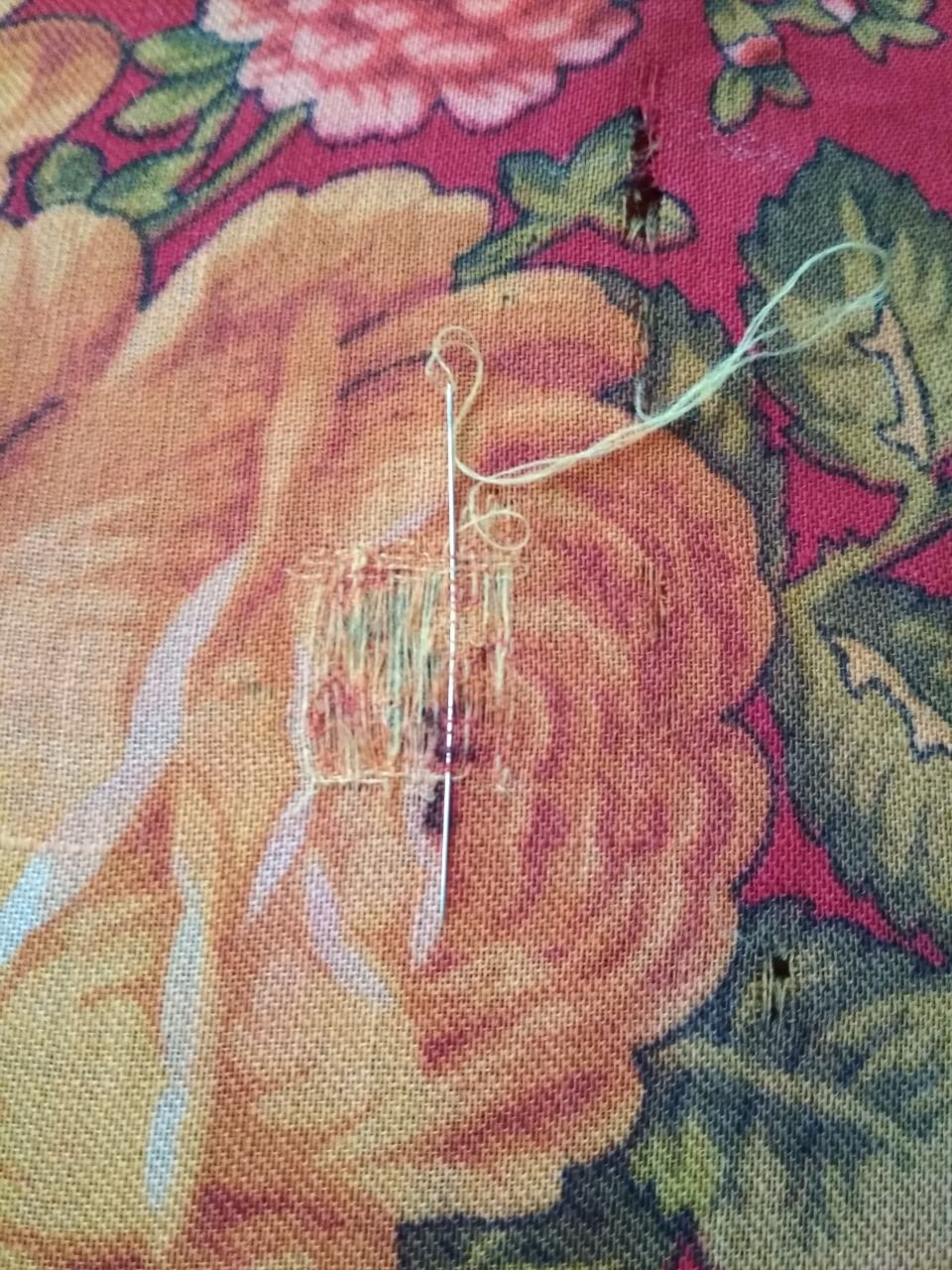 Дырочек, потёртостей и прочих дефектов на ткани было много... не считала.... просто целенаправленно штопала замеченное...
