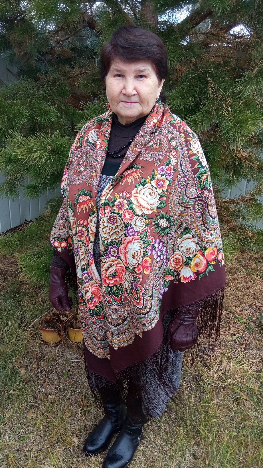 Таня Имбирь, Цвет граната вашей маме очень хорошо, вот просто очень, идеальная шаль для неё! А перчатки модные, а прическа...