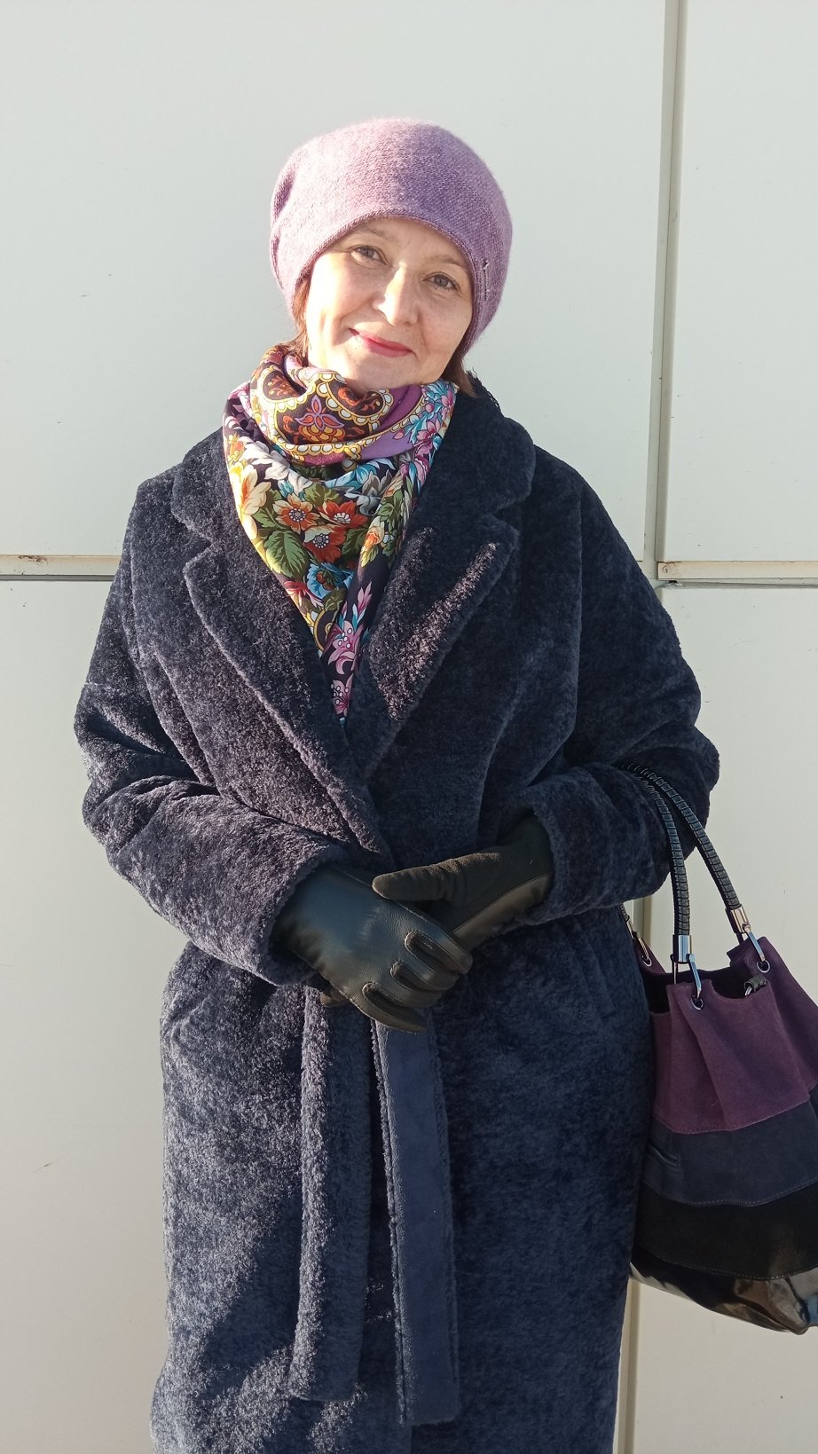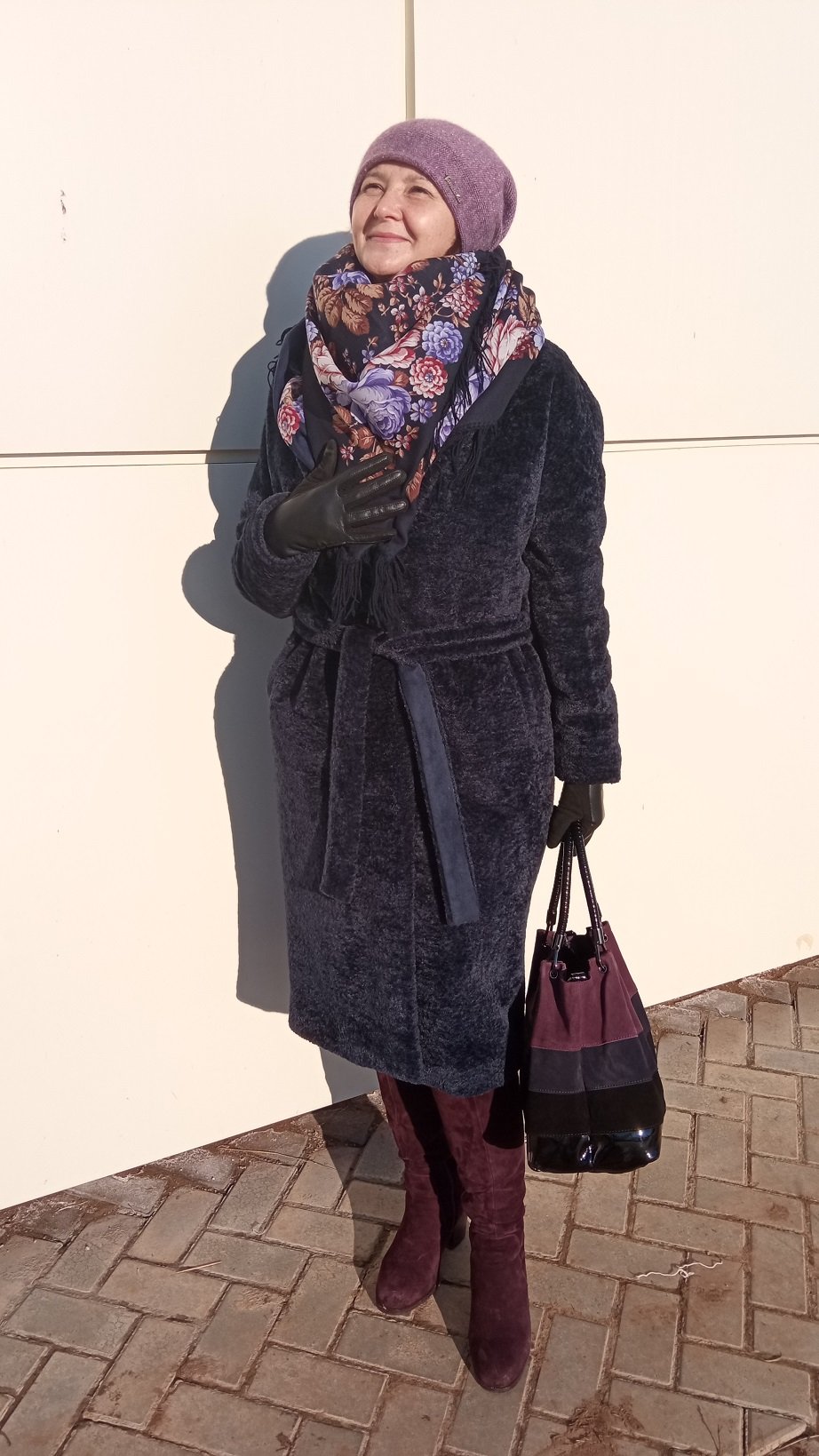 Пока, как ни странно, мне понравилось с оранжевым пальто - скрадывает яркость роз, о которой писала выше; с моим меланжевым теплым серым пальто классического кроя - не очень, фольклорность пробивается, у дочки попросила её однотонное оверсайз - неплохо, и - та-дам, с примеренным последним черным пальто, возможно, лучше всего. Что бы ни говорили, люблю я черные пальто! У меня яркий цвет волос, они довольно пышные, и получается как бы два ярких пятна - мои волосы и розы шали на сером фоне, то есть "видно" только их, а чёрные волосы и огромные яркие цветы - классическая цыганка :lol: . Даже в шапке уже смотрится зачастую лучше, нет этого противостояния, если спрятать волосы. А чёрное пальто очень хорошо его убирает и придает нужную строгость, на которой розы - уже не такая "разлюли малина". Ну, и от намотки зависит многое зависит, показать всю красоту платка, как я люблю, не всегда получится.