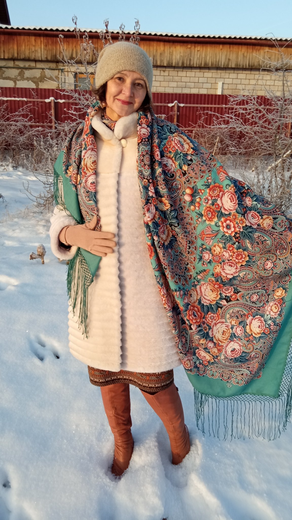 Очень хорошо. Умеете выбрать шаль, внутреннее чутье безупречное. Здесь она кажется яркой, это действительно так или на фоне белой шубы?