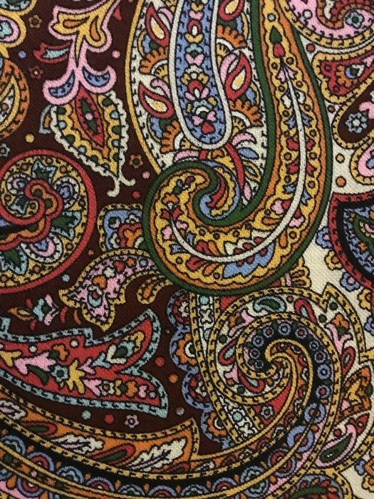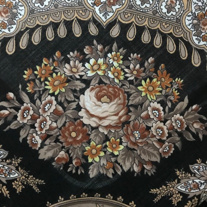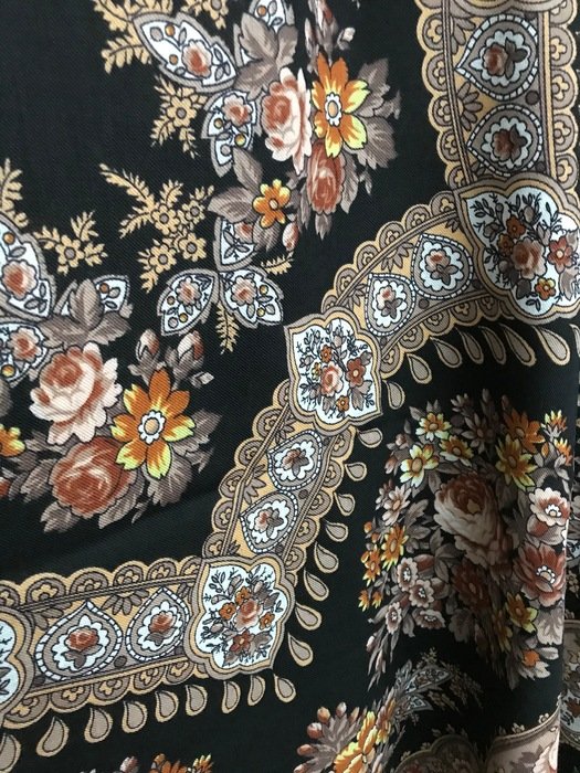 Скажу сразу, что узор очень достойный, не "каша", именно "узор", но на фотографиях выглядит намного красочнее. В действительности не такой яркий. Кайма холодного бежево-серого оттенка. Большого впечатления платок не произвел. Возможно из-за размера: повседневно, куцевато, обыкновенно, простовато, не смотря на красивый рисунок.Не понравилась ткань--мягче, но очень тонкий!