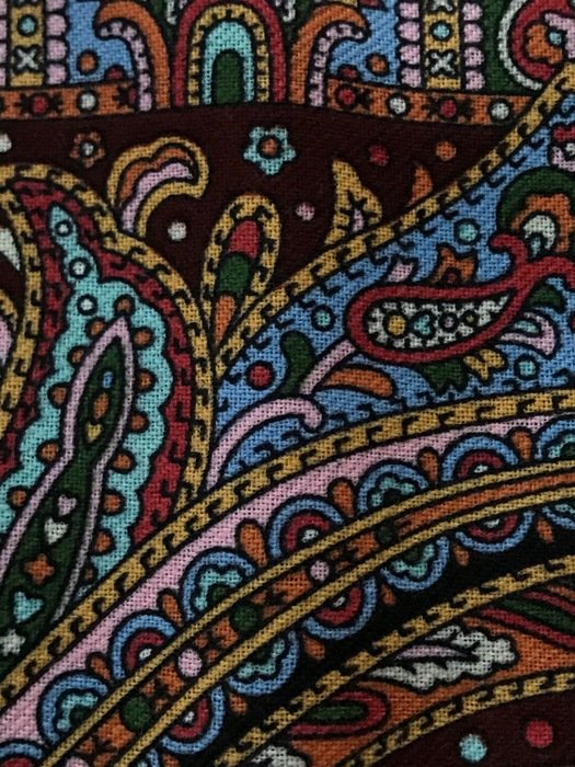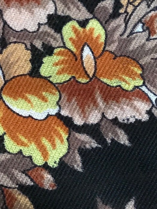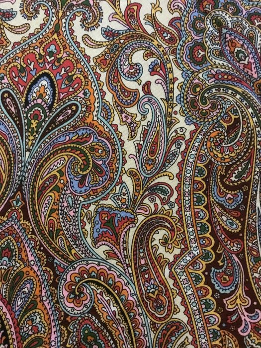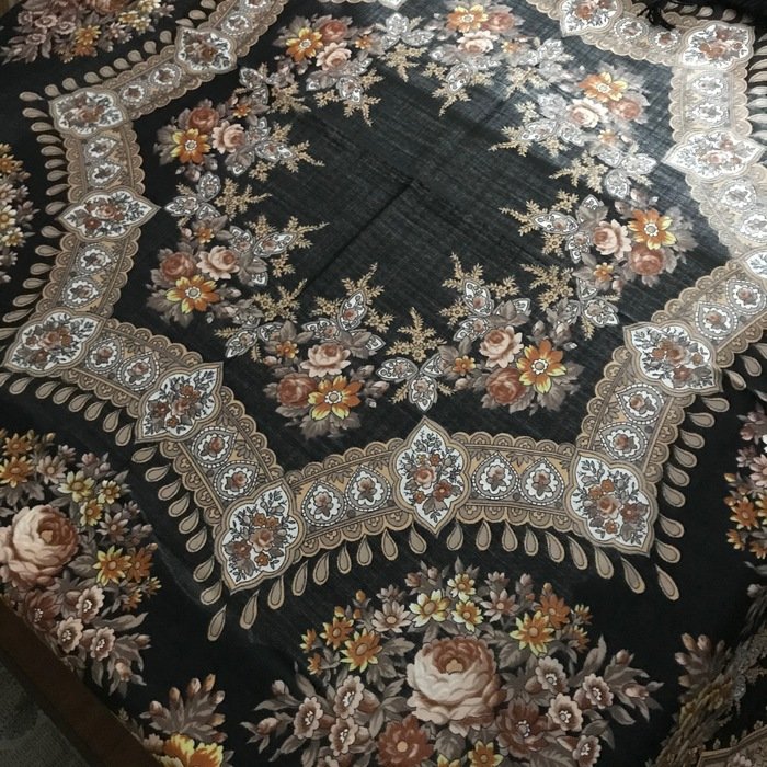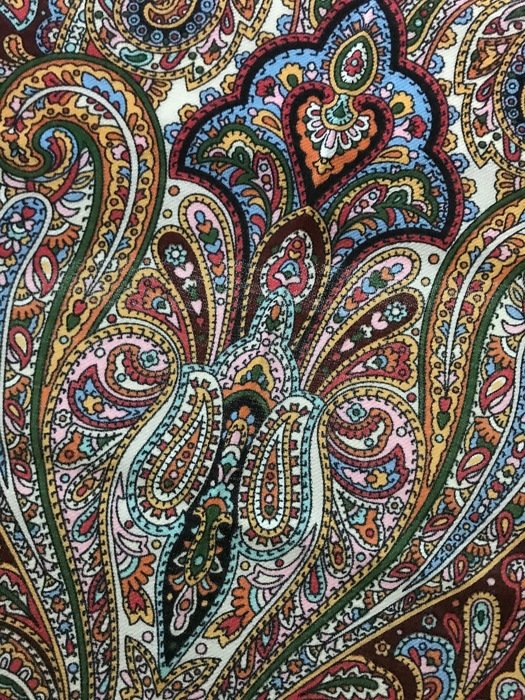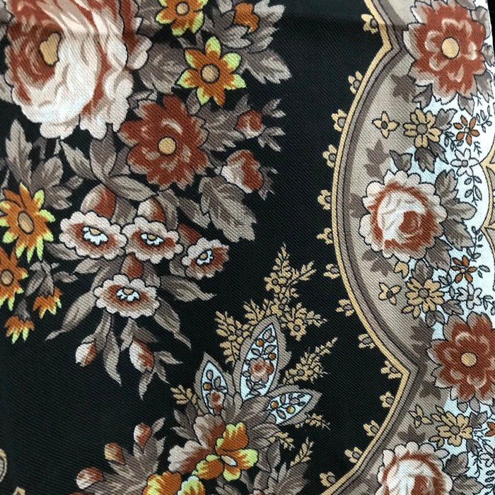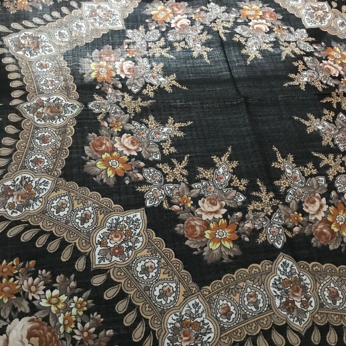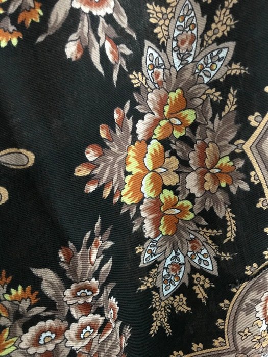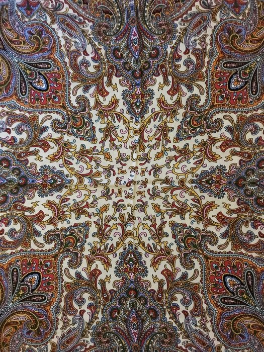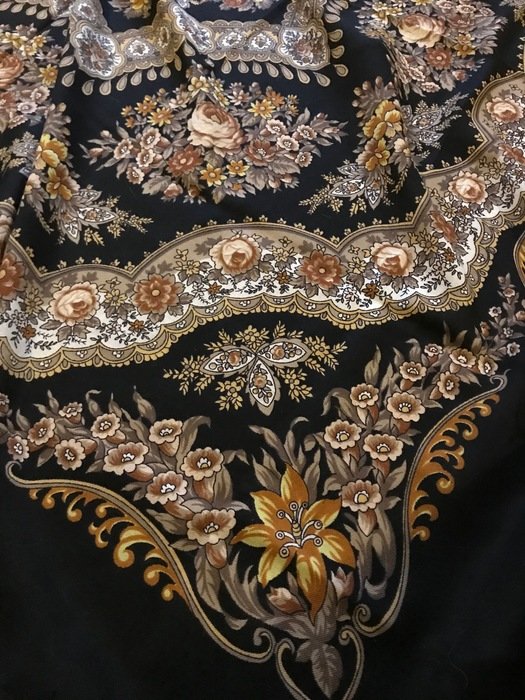 Скажу сразу, что узор очень достойный, не "каша", именно "узор", но на фотографиях выглядит намного красочнее. В действительности не такой яркий. Кайма холодного бежево-серого оттенка. Большого впечатления платок не произвел. Возможно из-за размера: повседневно, куцевато, обыкновенно, простовато, не смотря на красивый рисунок.Не понравилась ткань--мягче, но очень тонкий!