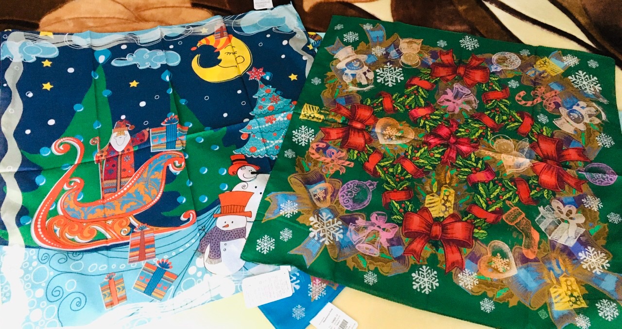 Получила посылку с новогодними хлопковыми платочками. Купила на подарки, не для коллекционирования, конечно. Все веселенькие. Себе надо один какой-нибудь выбрать :roll: