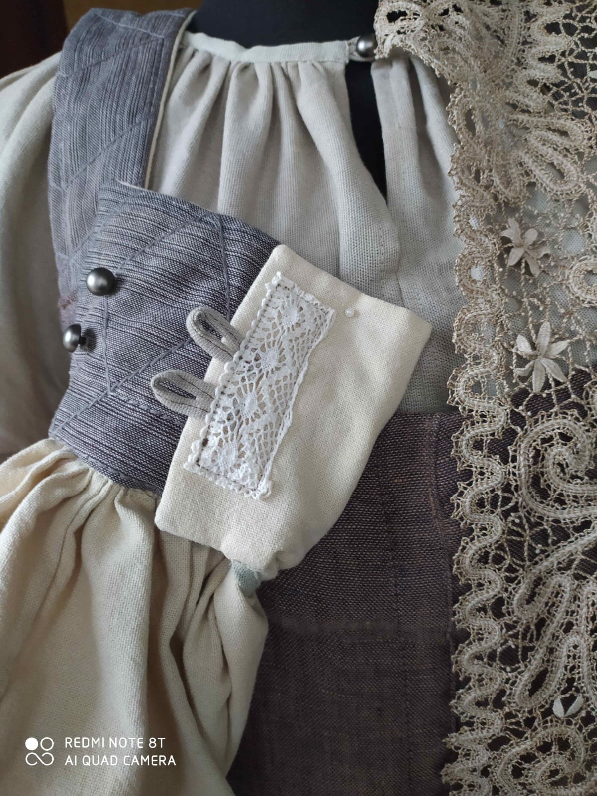 Осенью придумался сарафанный комплект почти ахроматический. В оттенках ноября. Такой "перевод" на современный язык,в багаже которого уже есть опыт минимализма. Но не монохромный,а с игрой природных негромких оттенков,с миксом тканей . Я хотела ,чтобы он был без декора,во всяком случае,традиционного -тесьма,кружево. Но старалась избежать скуки и чрезмерной аскетичности. Потому придумались стеганые лямки сарафана,такие же стеганые манжеты рукавов рубахи. И маленький "секрет хозяйки"- отделка льняным кружевом с изнанки. "Знает только грудь да подоплека..").