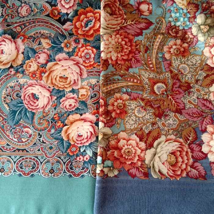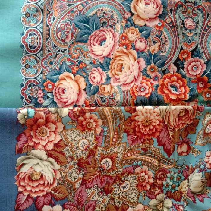 Лютик, Летучка, фото у меня, к сожалению, нет, но видела эти платки вместе. Сходство кажущееся, цветовая гамма разная. Тройка - приглушенная бирюза с неярким рыжим и лососевым, Именинница - серовато-голубая и розовато-бежевая. Сложно будет, обе хороши)))
