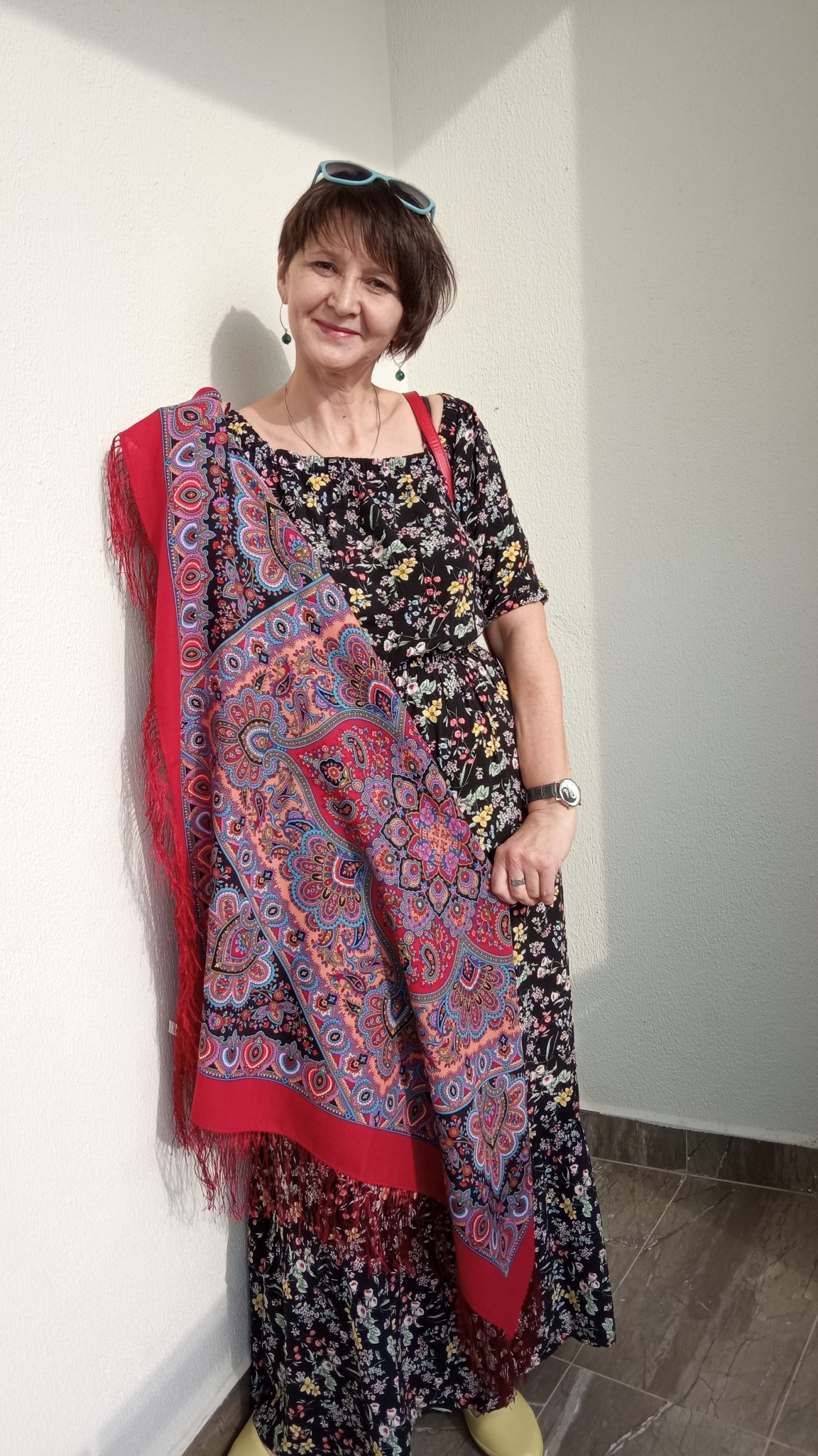 Покажу новинку ещё в одном колорите от Елены Жуковой шаль Мчится тройка 17 на плечах.