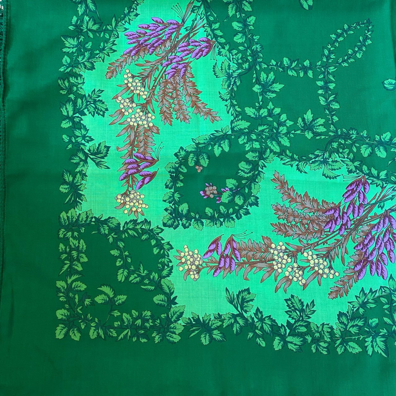 Фото на скорую руку Рябины-9. Мне очень нравится, зелёный такой настоящий. Бахрома немного непривычная, но я давно не покупала с шерстяной. По сравнению с моим стареньким "Над серебряной водой" немного короче и не заплетена "косой". Качество ткани для 146-х нормальное. Но я вообще не перфекционист, если рисунок мне нравится.