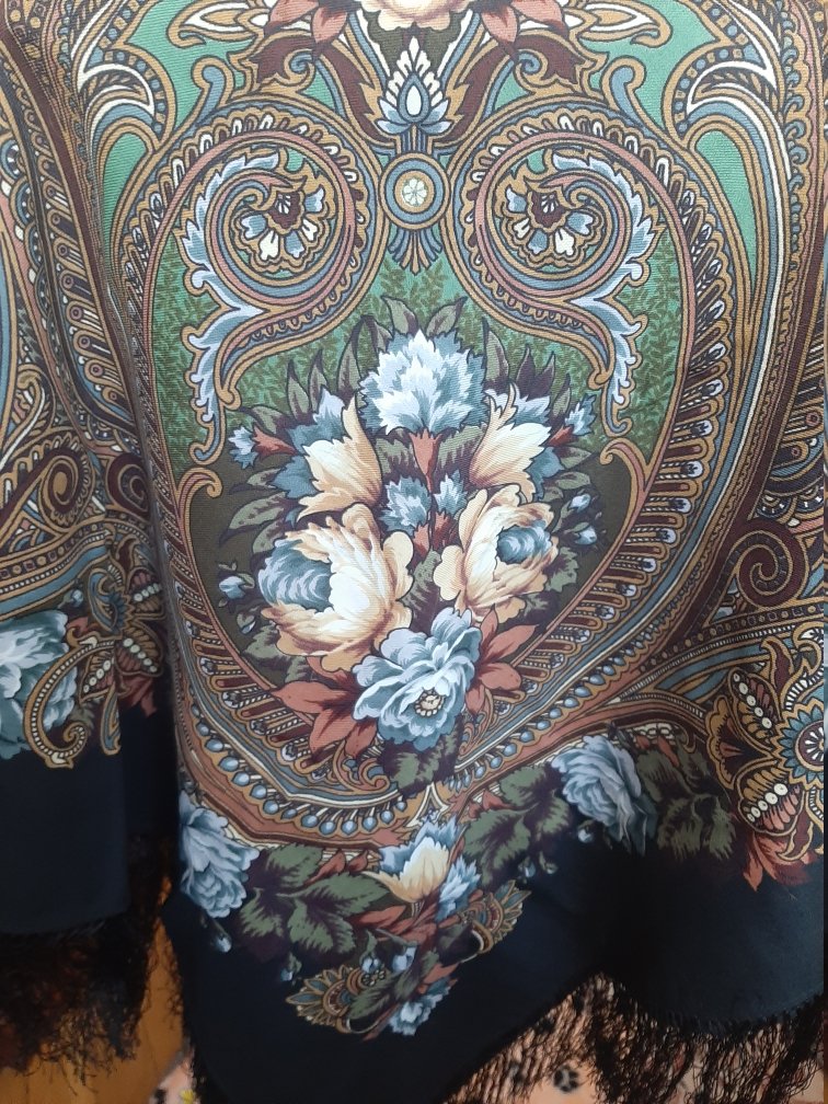 Впрочем, если носить на голове, бирюзинки почти все прячутся, а на первый план выходят сложные розовато-бежевато-золотистости цветочков и орнамента, оттенок которых я затрудняюсь определить (упрощать не хочется). Так что эта синяя шаль совсем не синяя :D .