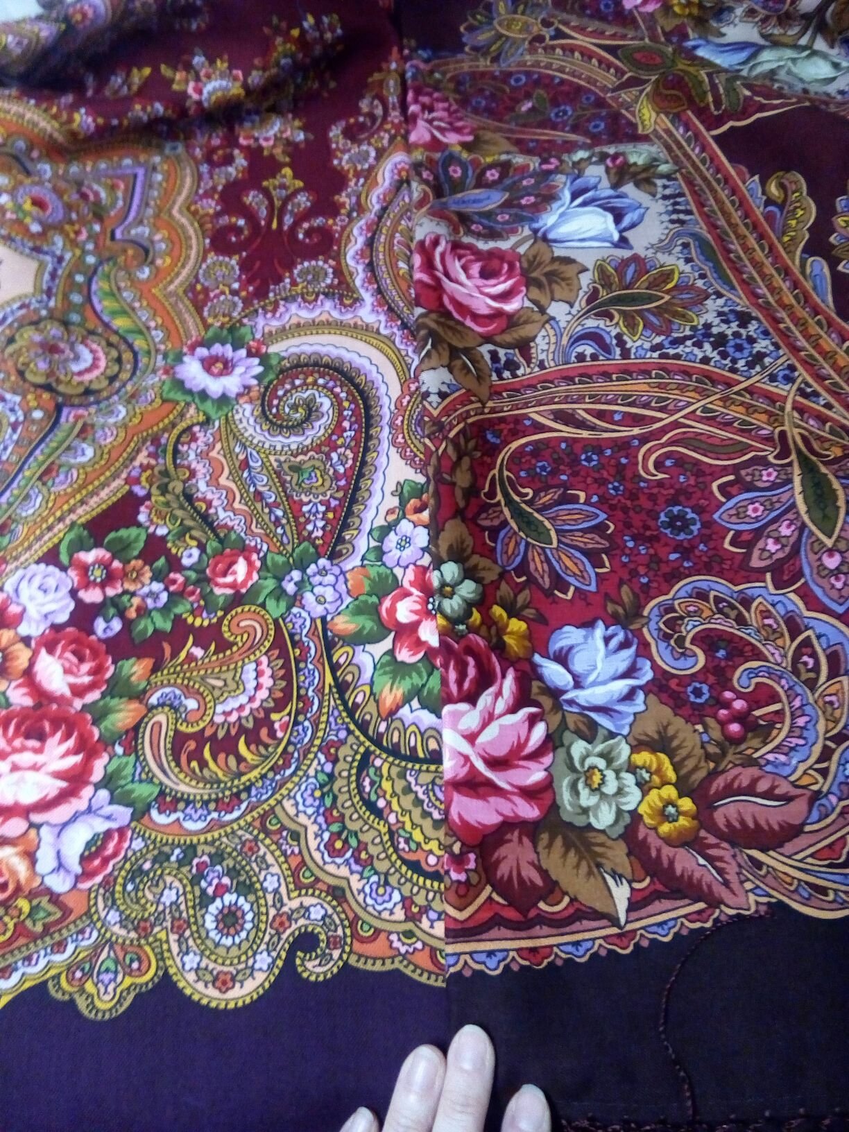 Добавлю сравнений "Мчится тройка" в 14 колорите с другими шалями, оказавшимися под рукой. Фото с телефона у окна в комнате. В жизни краски чище, на фото получилось чуть больше припыленности (или я так вижу).