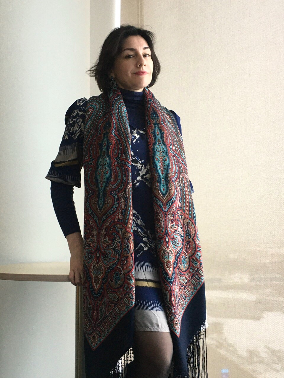 Nathalie, смелый микс с платьем,очень подчеркнул пунктирные линии на шали.Тоже люблю так складывать,-широким шарфом,прекрасно смотрится.