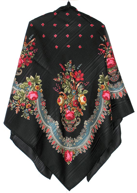 Этот платок интересен тем, что у него нет выраженной линии каймы. Квадрат образуется всего лишь несколькими цветками. А если смотреть на угол, то кажется, что квадрата вовсе нет, цветы свободно разбросаны по полю.