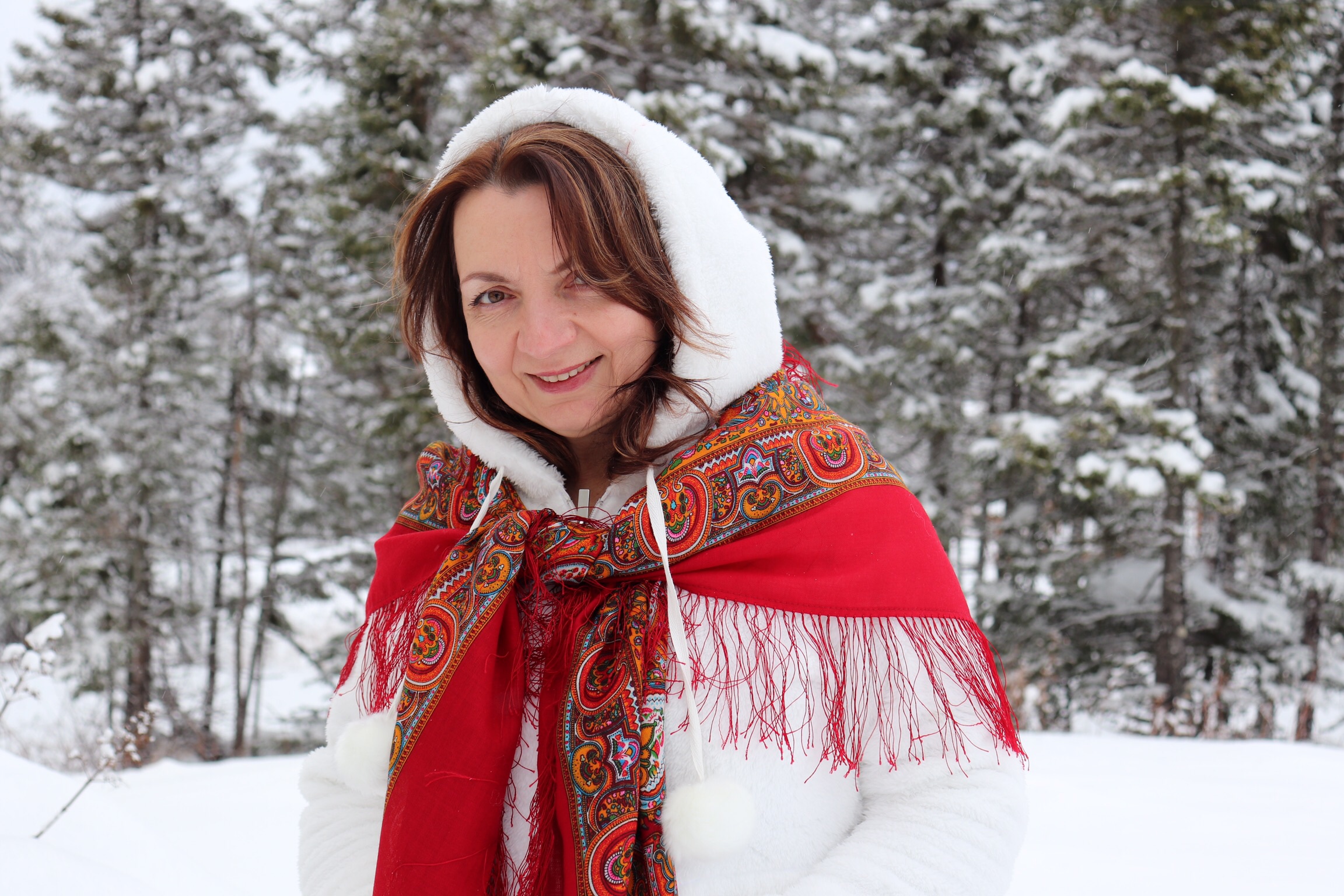 Russka ох красота какая. Красное на белом и подпевает засенежненный лес. Невероятное зрелище. Испанские платки в любом колорите интересные. Можно иметь их все виды, под любой случай!