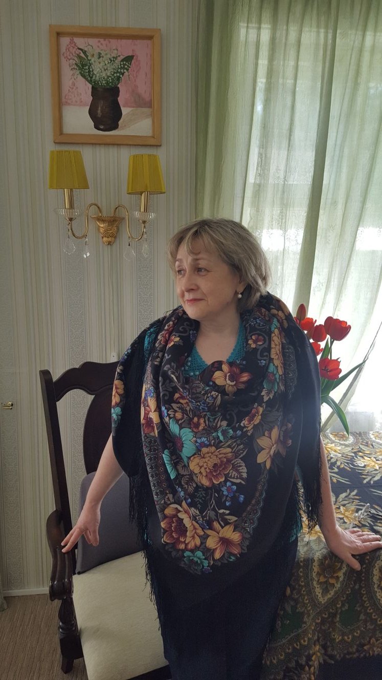 Впервые вижу эту роскошную шаль. На чёрном фоне, эти шикарные цветы и ваш цвет волос - ещё более выделяются, особенно при дневном освещении. Красиво