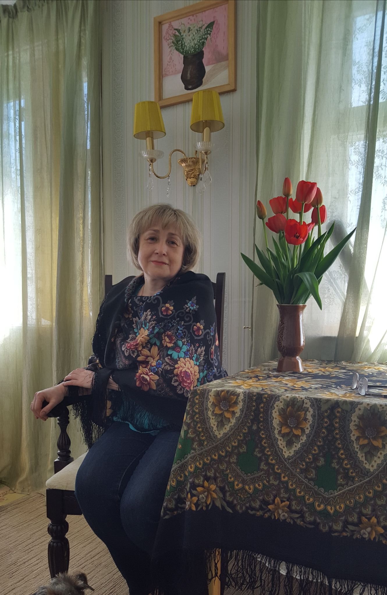 Впервые вижу эту роскошную шаль. На чёрном фоне, эти шикарные цветы и ваш цвет волос - ещё более выделяются, особенно при дневном освещении. Красиво