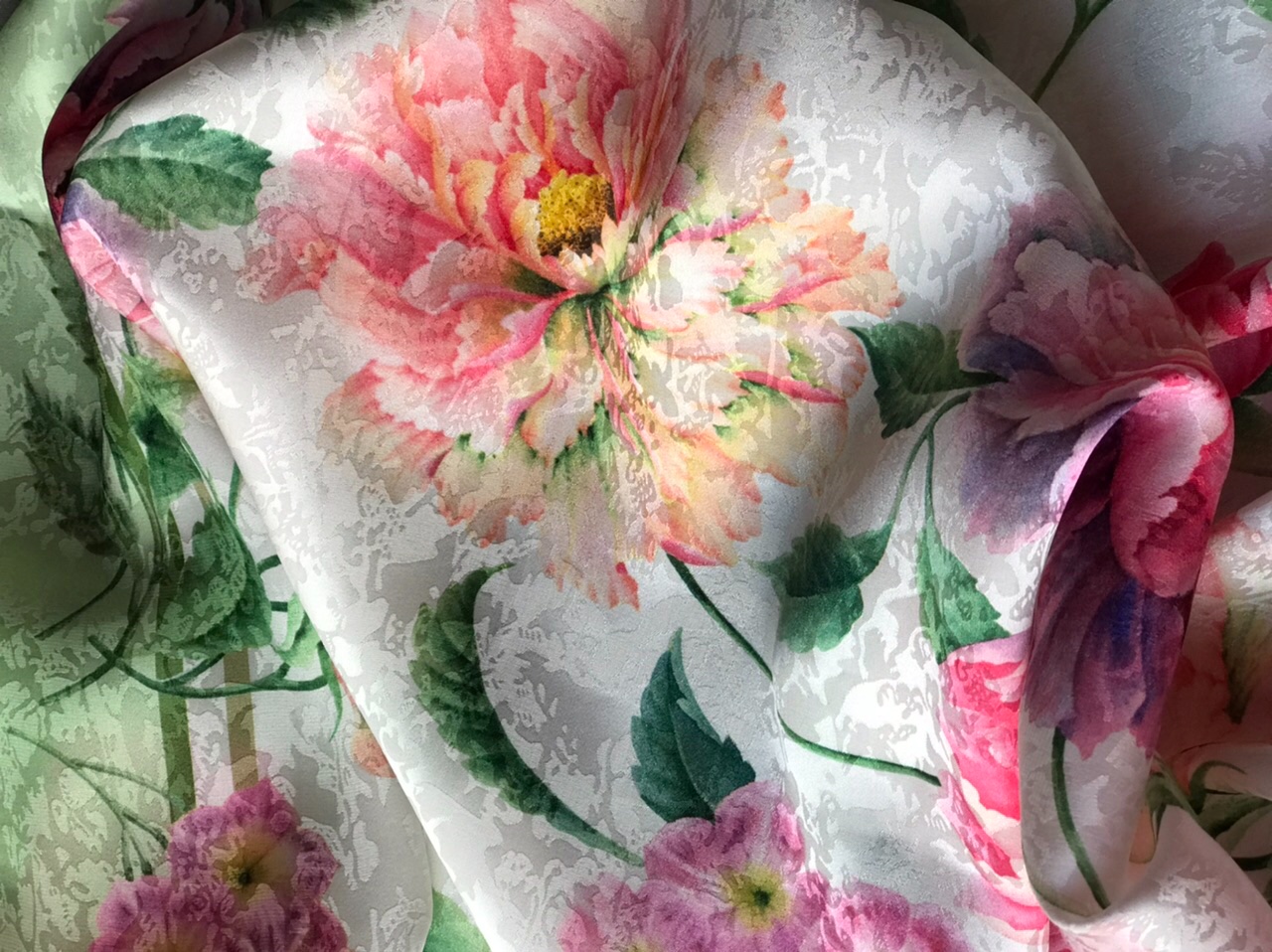 Во время скидочного бума на шали случилась у меня незапланированная удачная покупка шёлка. С удивлением увидела, что совсем нет фото этого платочка в архиве, поэтому, решила восполнить пробел.