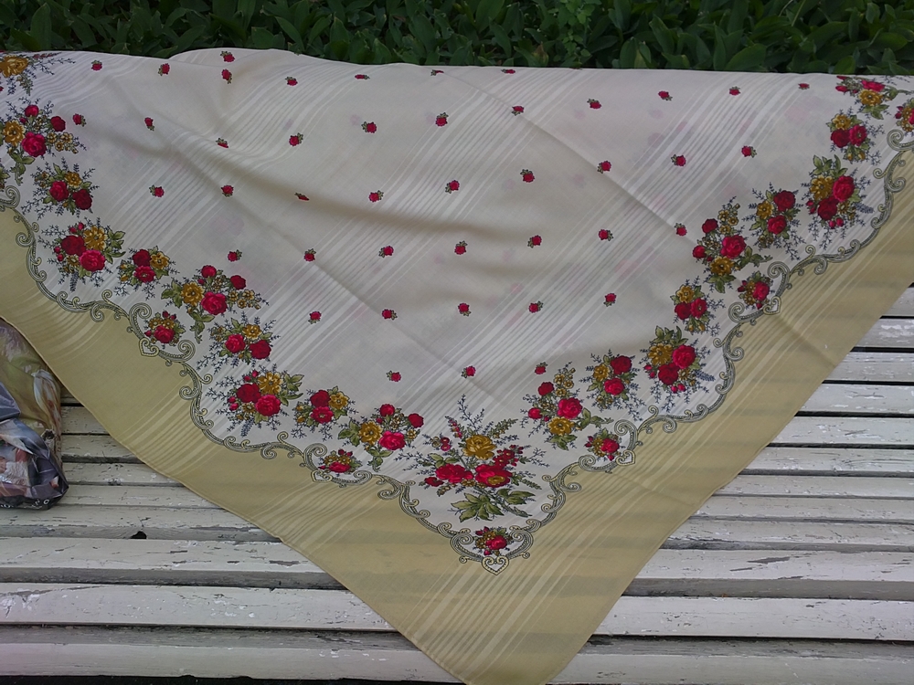 "Уважаемые Знатоки"! Не знаю откуда появилсяв нашей семье вот такой платок. Размер 90х90. Шелковистый, но не шелк. Плетеная шелковая бахрома в два ряда клеток. Бахрома местами повреждена. на платке были какаие-то пятна. Я нашла этот платок, разбирая мамины вещи после ее смерти. Теперь даже не у кого спросить, чей это платок. Может быть,одной из моих бабушек или еще чей? Наша семья родом с Украины, из Хмельницкой области. сколько себя помню, в нашем селе все женьщины носили платки. Да и сейчас носят. Платки сопровождают людей по всей жизни. Ими перевязывают гостей на свадьбе, с ними провожают в последний путь, повязывая на руку всех присутствующих на похоронах. с детства помню, как мама, собираясь в отпуск, покупала х/б Павловские платки. Эти платки хранились у бабушки в сундуке (скрыне) "на смерть", как говорила бабушка. Такие платки показывали на форуме. Мы, дети, очень любили рассматривать платки и шали. Шали, думаю, были очень не дешевые. Поэтом их было не очень много. В основном они были светлые. Сейчас в нашем доме есть несколько больших шалей с шерстяной бахромой клетками. Мне думается, что они мне ровестники. Очевидно стирались, т.к. краски немного поплыли. Фотика сейчас нет под рукой. Покажу их в следующий раз. А сейчас представляю вашему вниманию хлопок о котором писала в начале. Рисунок на платке как будто нарисован акварелью. Красок не много, но они живые и яркие. После стирки ничуть не полиняли. Цвет платка ушел в синеву, а на самом деле он слегка кремовый. Ткань шелковистая и слегка похрусывает, если с усилие провести по ней пальцем. Это может быть Павловсий Посад?