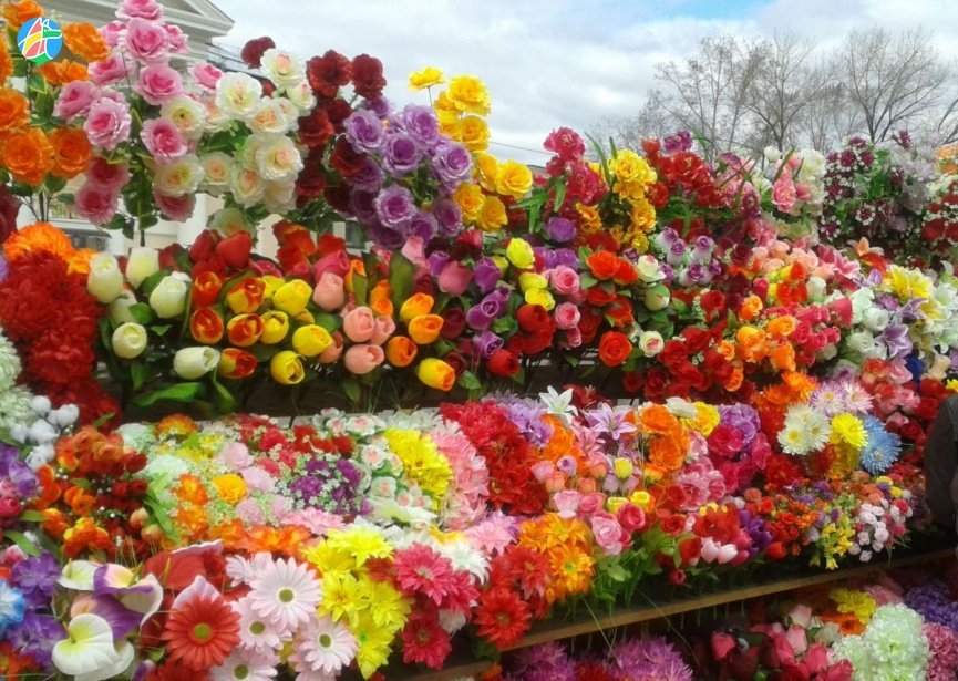 А в традиционном народном колористическом каноне совсем другая шкала. Яркое - конечно,ведь тусклое не только глаз не радует,тусклое - это не окрашенное,это несделанное,дешевое и недоосуществившееся. Но яркость не бессистемная. Народное искусство,костюм и даже старинные шали точно соблюдают определенные представления. Они строятся на великолепном пониманиии того самого цветового круга. То есть цвета используются контрастные,распологающиеся друг напротив друга,усиливающие звучание ,- оранжевый с фиолетовым,красный с зеленым, возможно и красный с синим, белый - с красным,как извечная пара, желтый с голубым...и так далее. Сдругой стороны,используется контраст,- если один цвет насыщенный,то другой светлый. Этот колористический канон понятен и по музейным костюмам, он живет в народных промыслах,про него наши многие шали,которые мы и называем ,не очень ошибочно,- "фольклорными". Но это те сферы,с которыми мы в живой повседневности не очень-то сталкиваемся. Варежки - тот редкий случай,где народный цветовой канон уцелел и воспроизводится,передаваяси из поколения в поколение. И,потом,варежки,- они маленькие,их вполне можно потерпеть и в городском look"е. Но есть один момент,где мы все встречаемся с этим традиционным цветовым каноном. И,обычно,это нас ошарашивает и не в хорошем смысле. Меня это просто оттолкнуло,когда я это увидела. Но и задуматься заставило,- а почему? Что за этим стоит,если оно везде так? Легче всего осудить непонимаемое,я не исключение,но,сделав усилие,иногда можешь наткнуться на открытие чего-то. Искусственные цветы для кладбища,- вот где мы все можем увидеть уцелевшее цветопонимание.