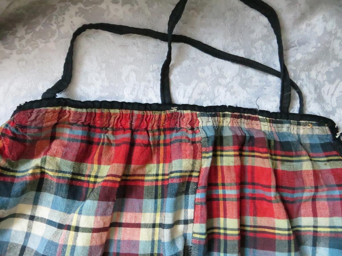 Хотела поснимать детали, однако, еще пристраивая сарафан на вешалке, была озадачена: он не хотел висеть ровно. Удивило и странное распределение сборок: не симметричное относительно лямок. Это навело меня на мысль, что они были перешиты. Зачем? Почему их перешили неправильно? Или все же правильно?... Замерила длину швов. Точно! Один оказался существенно длинее прочих (114 см, а противоположный ему 105 см). И тогда сборки встают на свои места. Две передних точи (сборка умеренная), четыре задних (сосборены сильно). Но - неожиданно для меня - швы оказываются точно по центру переда и спинки. И еще более неожиданно, что впереди - самая некрасивая стыковка. Везде клетки подогнаны, а тут, на самом видном месте, такое значительное расхождение (на фото хорошо это видно). Предполагалось прятать под передник? Зато это объяснило причину перешива лямок: видимо, в более позднее время сарафан носили уже без передника. И еще одна загадка: разрез. Точнее, его местоположение. Мне представляется логичным разместить его в шве - по центру или сбоку. Если не хочется по центру или неудобно сильно сбоку, я б просто сдвинула всю конструкцию на половину ширины полотнища. Может я чего не понимаю?