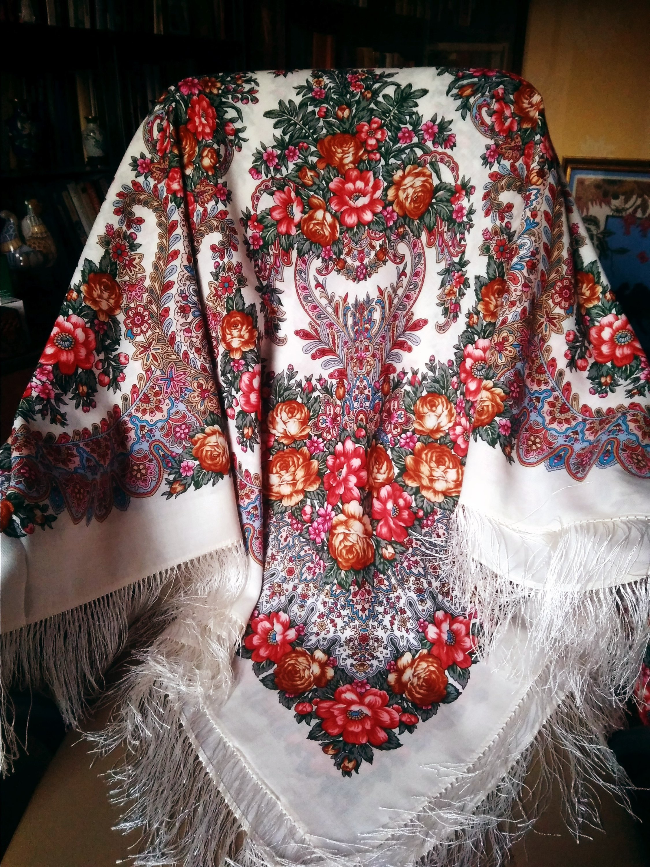 На мой взгляд, прекрасный образец современного варианта традиционного белопольного русского платка. В народе более популярен роскошный 18 колорит, но для меня цветочные рисунки Белокур слишком избыточны, а на черном фоне эта барочная избыточность меня просто забивает (ногами), белый грунт делает рисунок более воздушным что ли…
