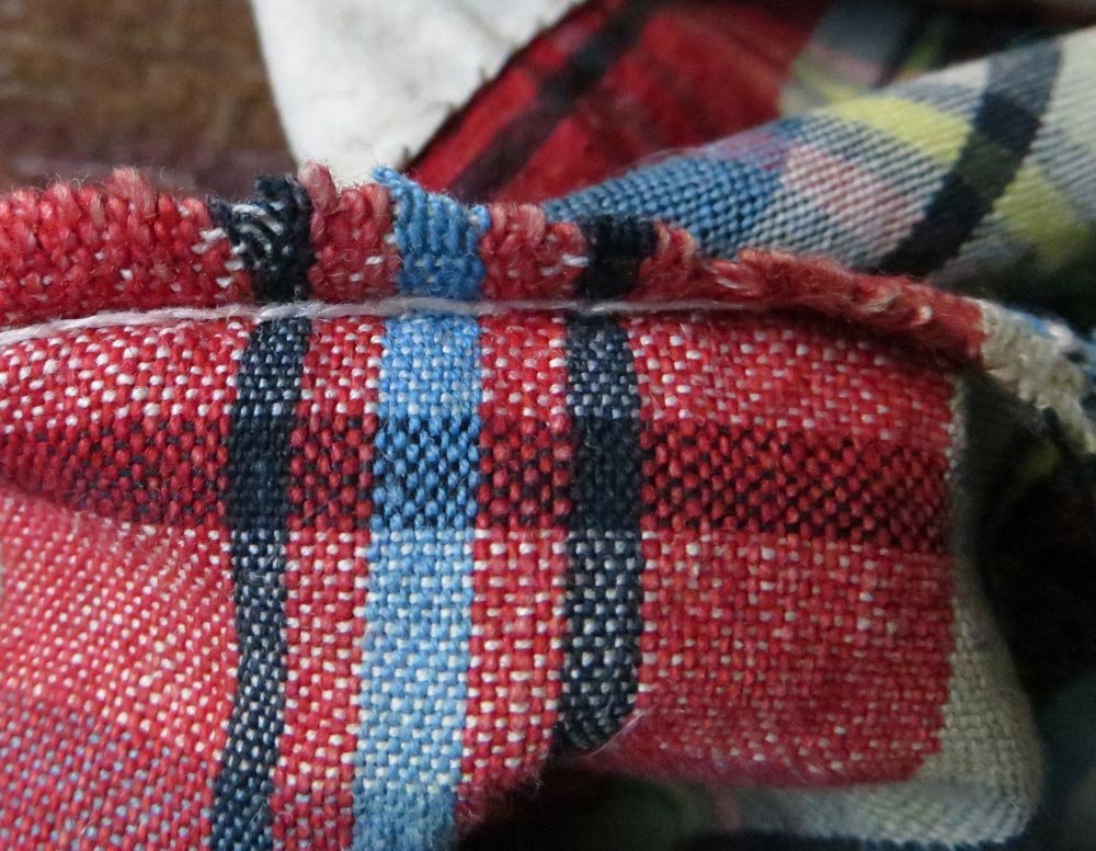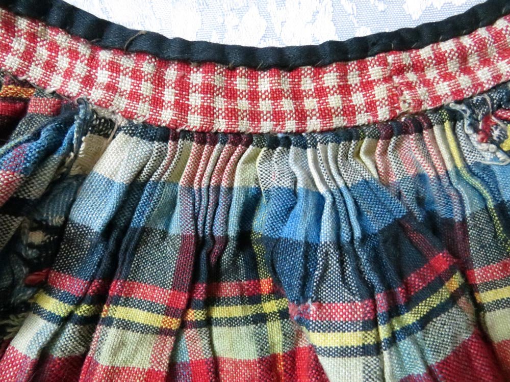 argon, ровненькие складочки на спинке, но клетка не совпадает. А ткань отличная, одно удовольствие от макрофото. Предположу, что перешивали сарафан, расставляли, да и не смогли повторить успех спинки спереди.) Это ж не всем дано, как тогда, так и сейчас, уровень мастерства и желания обучаться этому делу разный. Видимо тогда же, при перешиве, и разрез ушел в подмышку. А может и задумано так. Технологий общих каких-то, считающихся авторитетно правильными, ведь не было, был опыт поколений. Кстати, чаще вижу разрезы именно так, не в шве, а посередине полотна, наверное, считалось изысканней и давало возможность обтачкой обработать полностью весь верхний срез, дополнительно украсив его.
