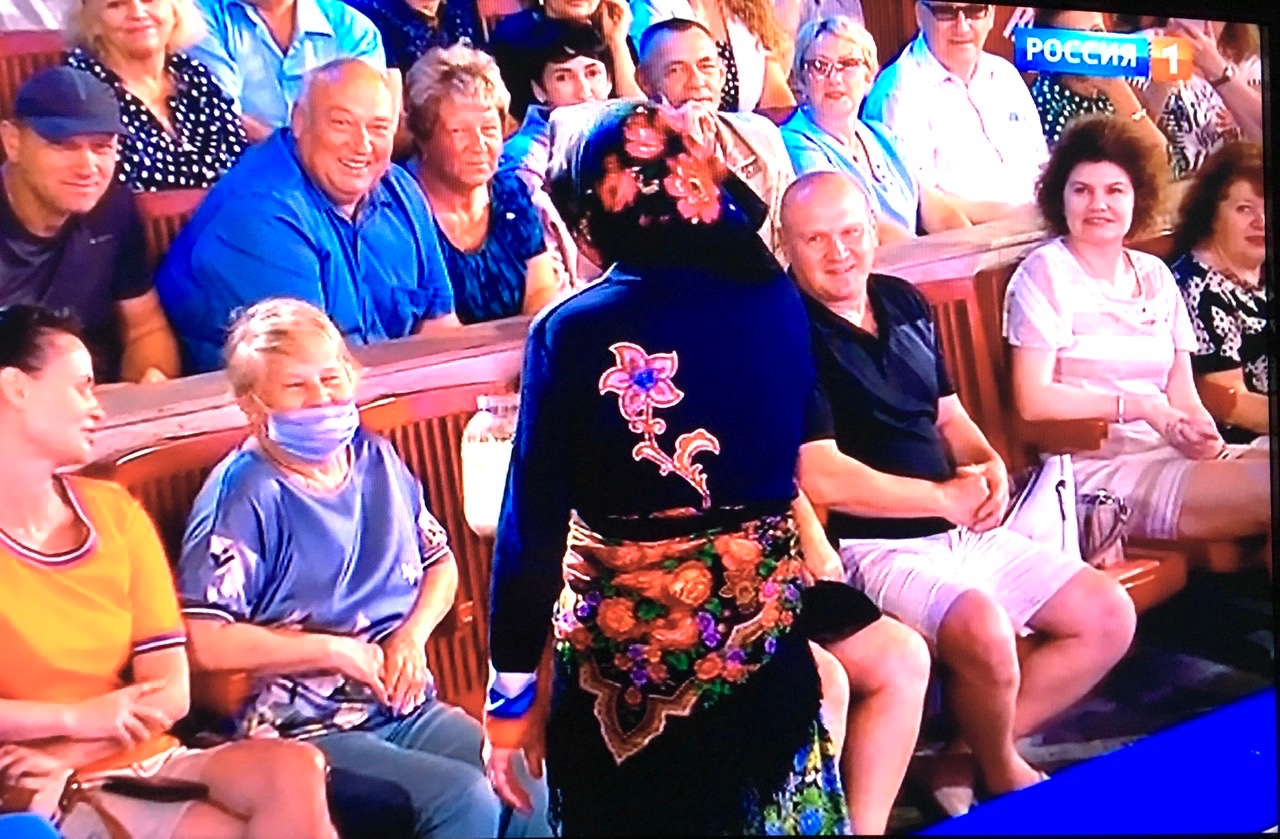 Не кино, юмористическая телепередача. Цветочек носит Русскую красавицу 18, на бёдрах.