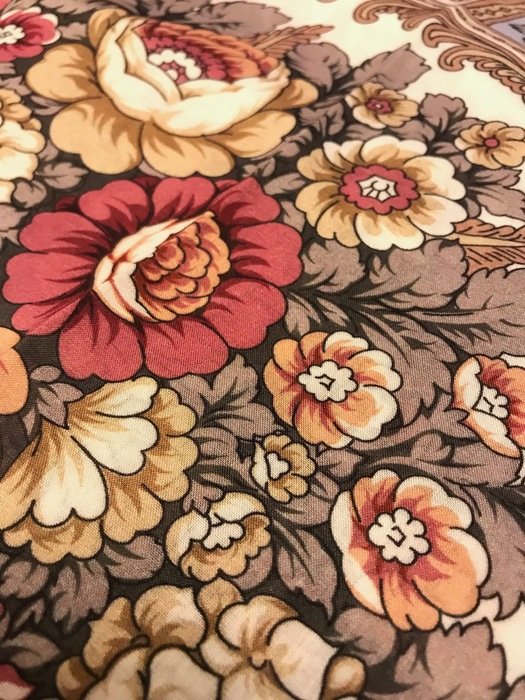 Но я как-то справилась с Пионами, которые с зелеными пионами. Ещё до покупки была убеждена, что носить не буду, купила исключительно из-за любви к зеленым пионам. Но надевала, и не один раз, не на светлое, а на зеленое и коричневатое - отлично вышло.