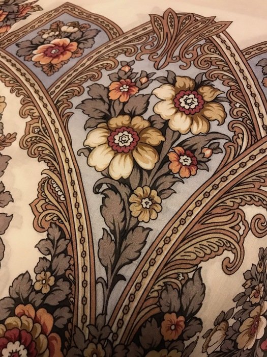 У Пионов ещё в середнике такие редкие некрупные цветочки - прям постельное бельишко. Но если свернуть шарфом, то получше, и зеленые пионы на виду. С Праздником, думаю, будет проще, рисунок на нем не очень-то бельевой. :)