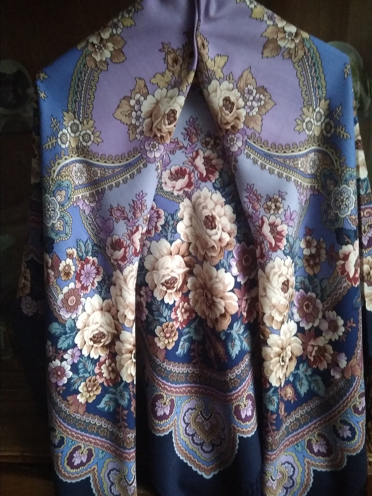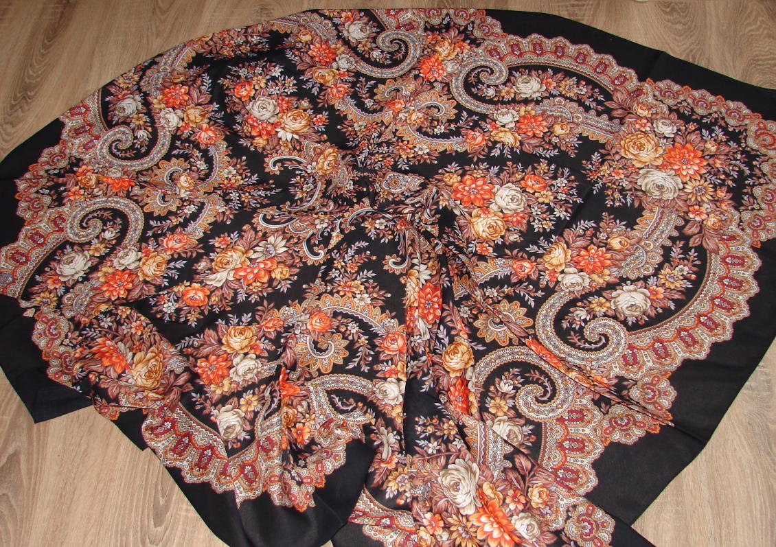 Уже написала выше, что понравилась ткань, показалась плотней, чем у Пионов и Ферганы. Но платок ещё новый, активная эксплуатация и стирка это могут изменить.