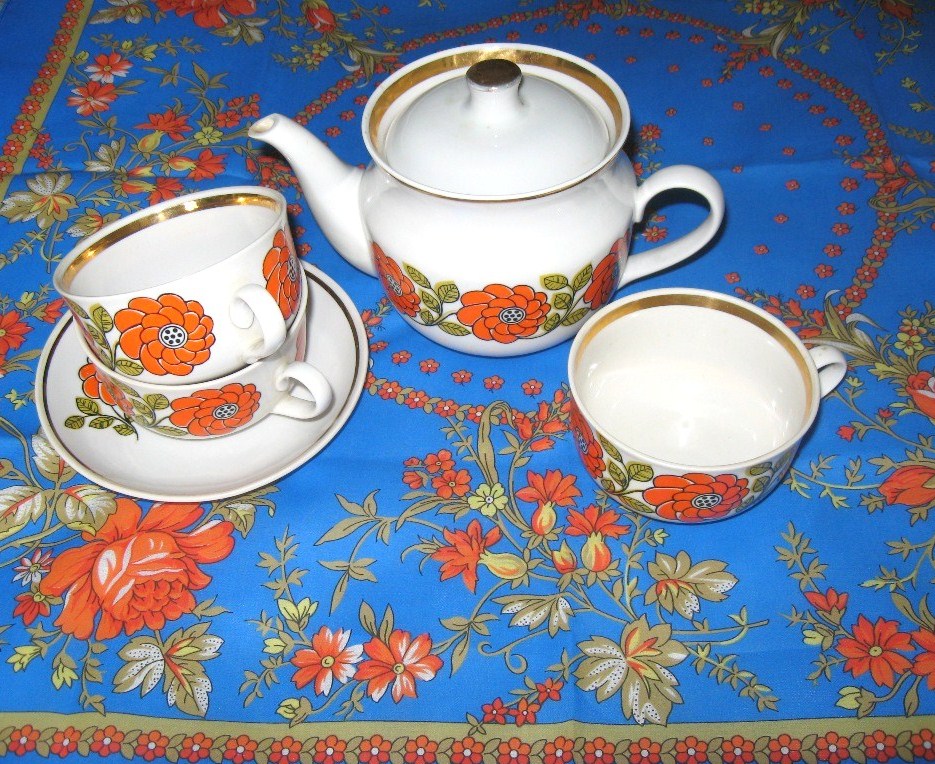 Этот сервиз был куплен 30 лет назад. С ним связано множество семейных воспоминаний. Мы всей семьёй отдыхали в Крыму, там сервиз и купили. Попросили в магазине его упаковать как следут, везти ведь далеко. Когда приехали домой, то обнаружили - нет сахарницы, зато в наличии два заварных чайника. Мама установила традицию. Для каждого времени года - свой праздничный сервиз. Этот использовали летом. Так получилось, что у меня, брата, отца и мамы дни рождения летом, поэтому море воспоминаний, связанных с празднованиями этого праздника. Сервиз простенький, сорт 2-й, даже почему то цену запомнила - 29 рублей. Когда купила батистовый платок "Беседка" долго не могла вспомнить что-же он мне напоминает. А когда пришла в гости к маме, поняла - цветовые гамма сервиза и платка перекликаются.