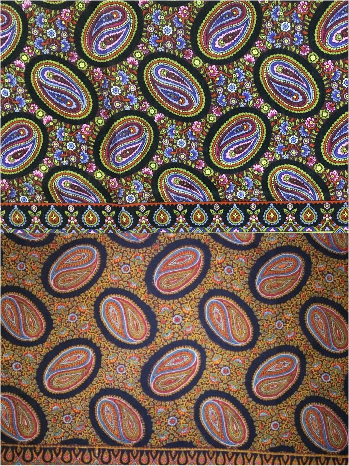 И там, и там в среднике орнамент из овалов с вписанными попарно огурцами-«бута», ориентированных по диагонали под прямым углом друг к другу. Пространство между овалами заполнено очень похожими мелкими веточками, цветочками и листочками.