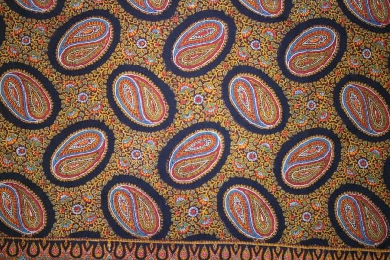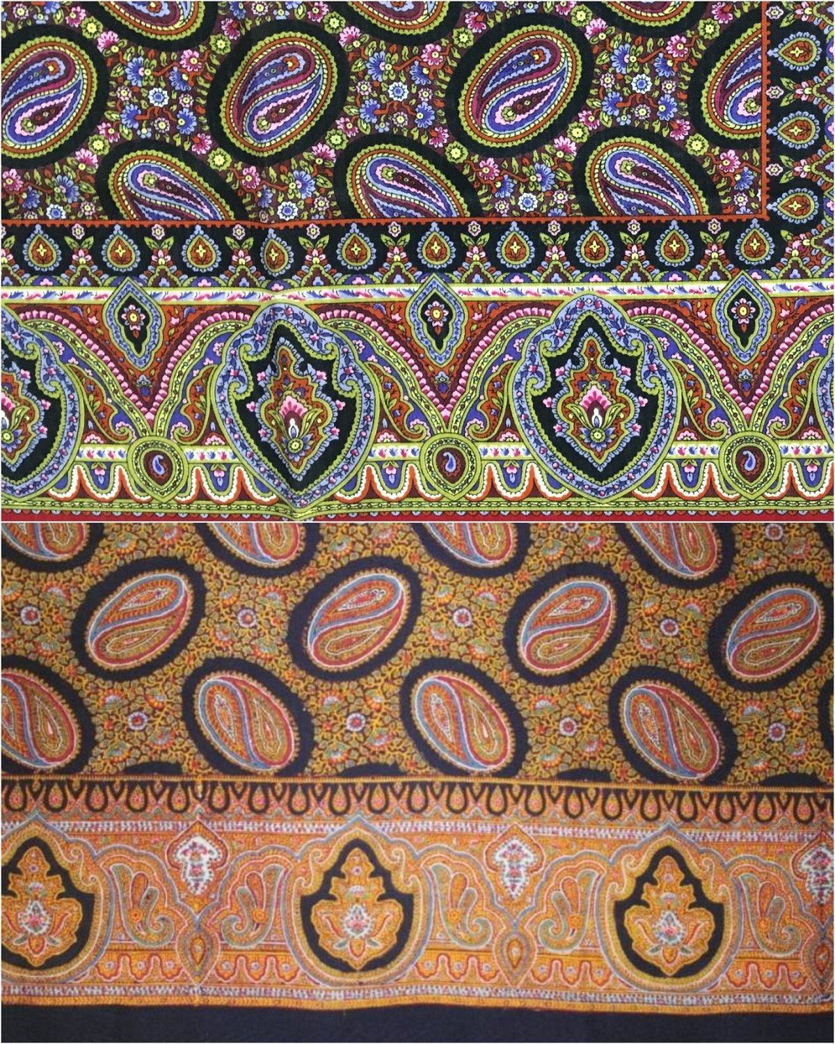 И там, и там в среднике орнамент из овалов с вписанными попарно огурцами-«бута», ориентированных по диагонали под прямым углом друг к другу. Пространство между овалами заполнено очень похожими мелкими веточками, цветочками и листочками.