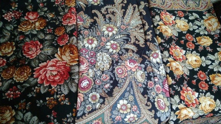 Пыталась сделать сравнения, но если колориты на фото сильно искажаются, делать сравнения колоритов как-то странно. Поэтому чуть-чуть приложила только для общего понимания, а именно – это совершенно разные шали , не только по рисунку, но и по цветовому решению (заочно думалось, что колориты будут близки)