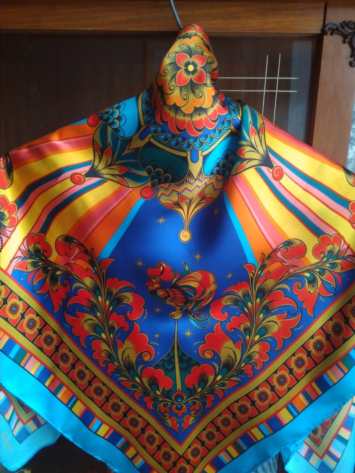 Как видно, это очень смахивает на Итальянский полдень, однако чувствуется другой живописный стиль , да и сам платок смотрится несколько по-иному ,более контрастно и в то же время более акварельно что ли - более мягкие контуры, более сближенные оттенки цветов и т .д. Ткань довольно сильно отличается от двух предыдущих, очень тонкая и скользкая, форму почти не держит