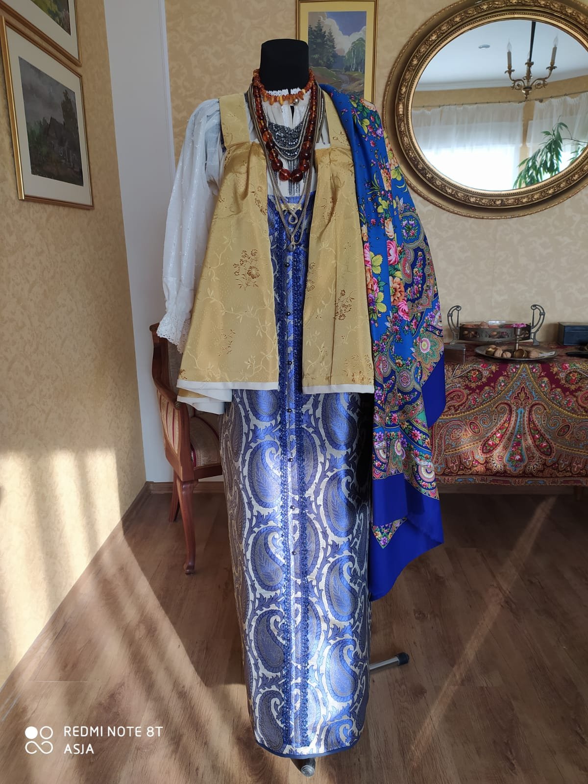 Дорогие девочки,делаю небольшую коллекцию,и то,что готово,хочу показать,а то пропала и носа не высовываю..) Васильковая ткань в жизни эффектнее,но очень трудная в работе. Надо было ее только на душегреи...но что сделано,то сделано) так что пока примерки - сарафан примеряет шали )