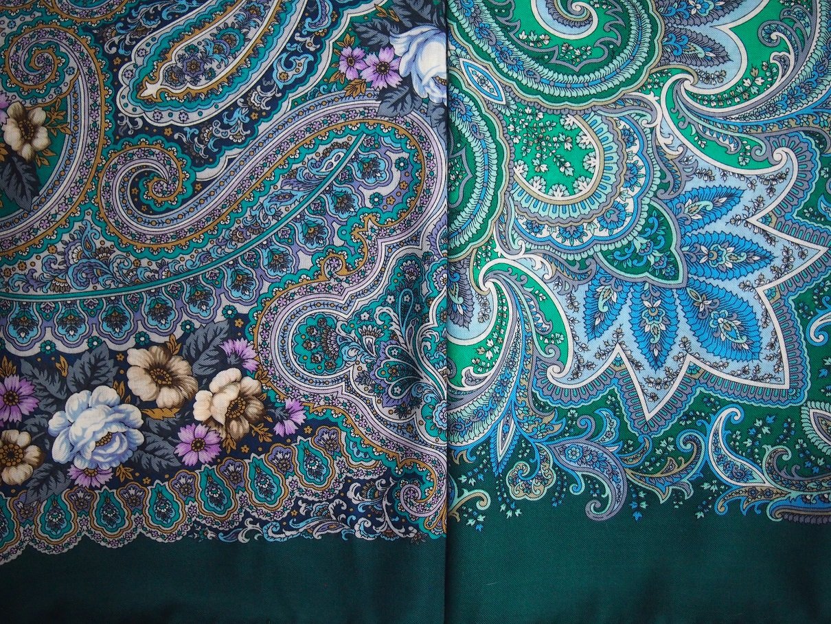 На мой взгляд оба платка скорее коллекционные, чем для повседневной носки. Здесь видим всю ту же тему, что и в прекрасных коллекционных каре Эрмес или платках ручной росписи из лионского шелка – в развернутом виде это настоящие полноценные художественные полотна, в при использовании по прямому назначению как предмета одежды – хаотичная мозаика красок и неясные обрывки линий, частей рисунков и .д.