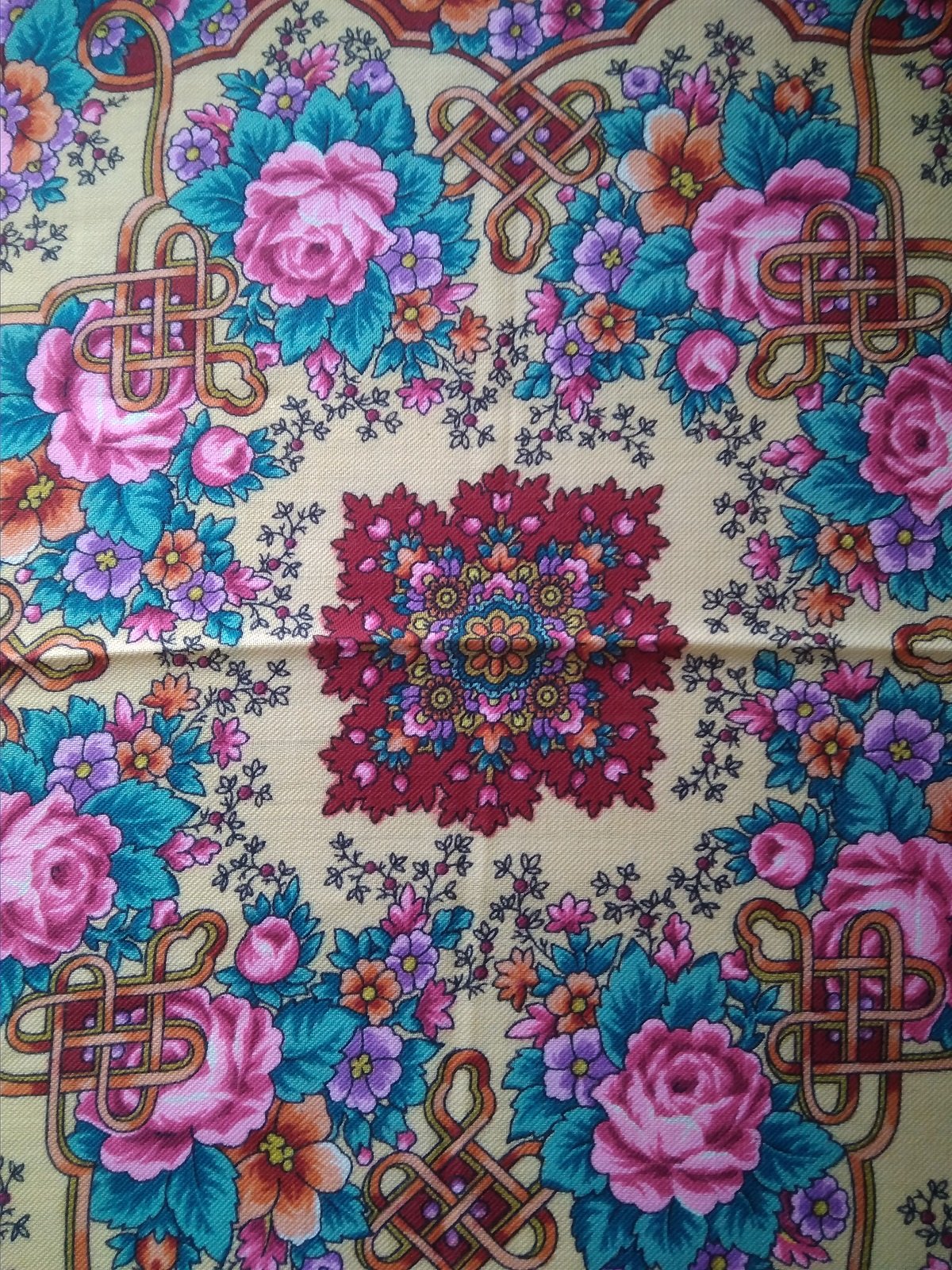 У меня на Восточных путешествиях навязана бахрома (кто о чем, а вшивый...), из-за этого платок как бы немного утяжеляется, выглядит солиднее и в практическом плане очень неплох на жару. Ну и совсем такие шейный малыши Татьянка, понятно что чисто для форсу. Вот такие среднеразмерные тоже купила в первый раз, и тоже в общем без особого энтузиазма, умом понимаю, что малоносибельный и не особо практичный в моем случае будет платок, но рисунок и цветовая гамма настолько хороши - в реальности смотрится как будто эти букеты как в цветном хрустале застыли, да стоил вроде не очень дорого, что не смогла устоять. За город куда поехать, может пригодится.