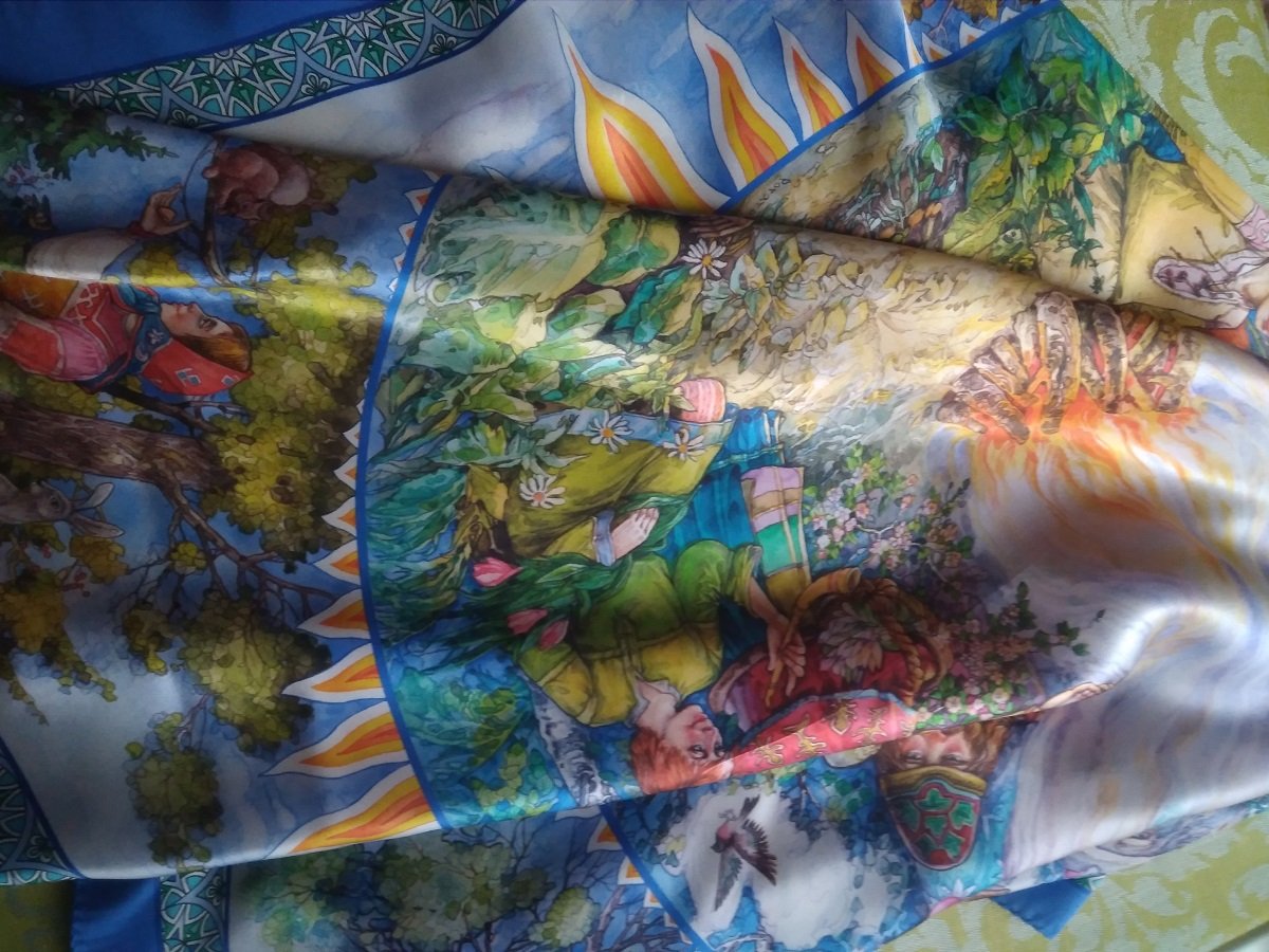 Особо хочу сказать о последнем платочке - "Цветущем лете". Рисунок нравится безумно, но ...хлопок! С одной стороны, этот рисунок на хлопке смотрится органично. А с другой стороны - как-то не цепляет меня такой хлопок (как и вискоза). А для утилитарности - не надо. Вот и никак не дозрею до покупки. Небольшой опыт использования ("Восточное путешествие", "Волшебная флейта") - совсем не впечатлил. Эти платки совсем недолговечны.