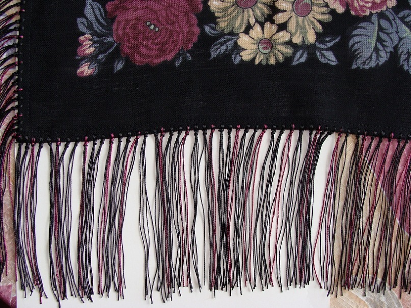 А здесь шаль висит изнаночной стороной, поэтому есть возможность увидеть машинную строчку на подгибке края шали. Хочу сделать такую же бахрому на платке "Пионы".