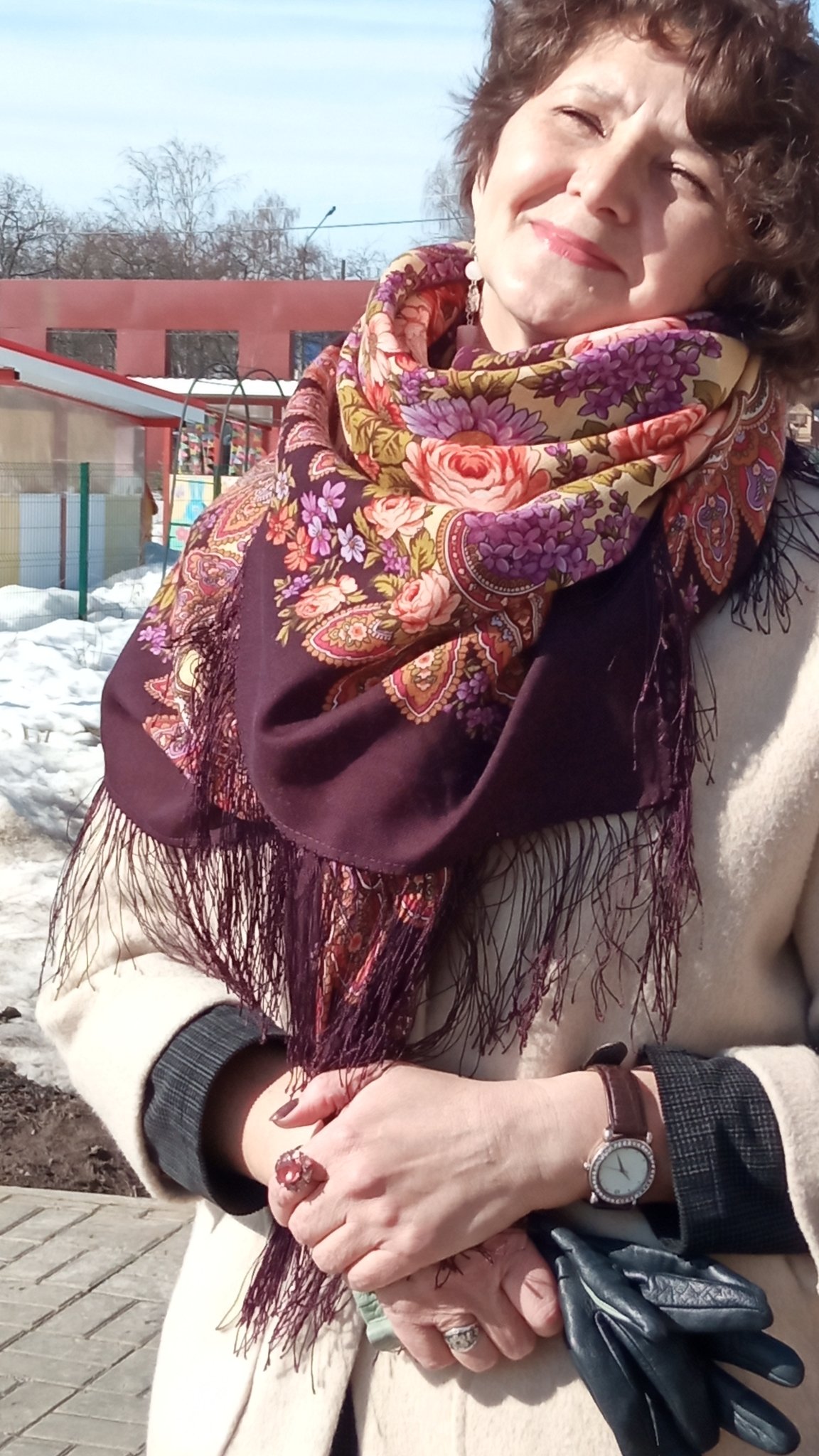 Марина_Марина Предлагаю сказать дед Морозу и снегу: "Брысь!". Очень понравилось в параллельной ветке сложение пальто и Остановись Мгновение, кстати, вам шаль на голове дивно хороша, а эти фарфоровые гирлянды роз особенно.