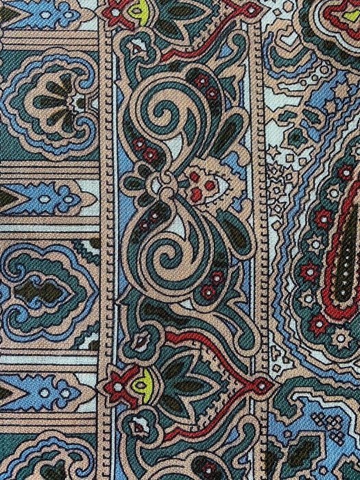 Кайма спокойно-синяя. Основные цвета -серо-голубой ( самый светлый), приглушенно-розовый -( на фото более бежевый) , бирюза разных тонов, желтый киви, темно-красный. Ничего зеленого, если не считать вкрапления болотно-коричневого. Основной тон платка сине-голубоватый.