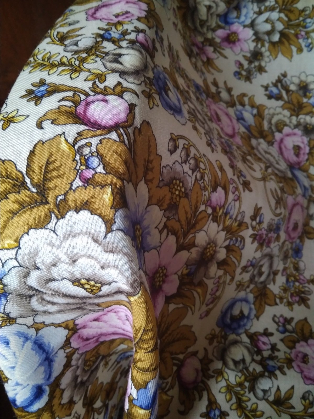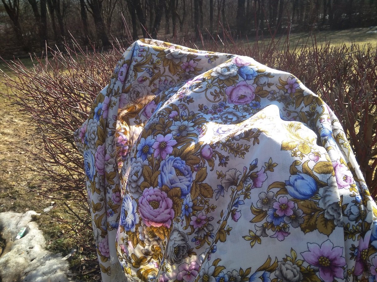 Ткань довольно плотная, упругая, не марля, рука почти не просвечивает. В тайне надеялась, что будет такой же «шерстяной шелк», как на Имбире-17 или В вихре танца-18, но понятно, что пора бы уже оставить пустые надежды. Тем не менее ни треска, ни липкости не заметила (про катышки не знаю, пока достаточно не износила), хотя все же при жестком и длительном …ээээ сложении/«сминании» ткань все же немного мнется (но 146-е кажется все так или иначе мнуться). Зато за все время с платка не упало ни одной бахроминки, а то в последнее время при разворачивании посылки весь пол усыпан вискозными «волосьями». В принципе у меня претензий к качеству нет (выпуск 31.03.21).