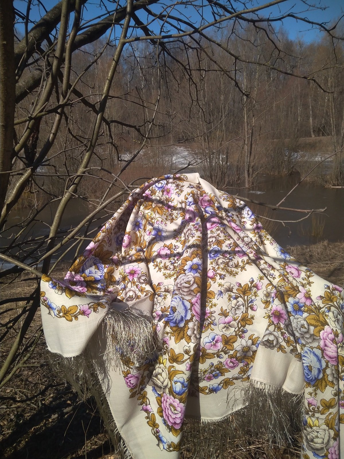 Главное – на всех фото, в том числе на фото с сайта, грунт платка выглядит теплым оттенком нечто среднего между слоновой костью и жемчужным, в реальности это скорее холодный экрю, т.е жемчужно-серый с чуть зеленоватым надцветом ("цвет воды в граненом стакане"), приближающимся к цвету канвы Дива -2, хотя конечно более размытый, менее определенный. Бахрома более насыщенного зеленоватого оттенка. Краски рисунка соответствуют действительности.