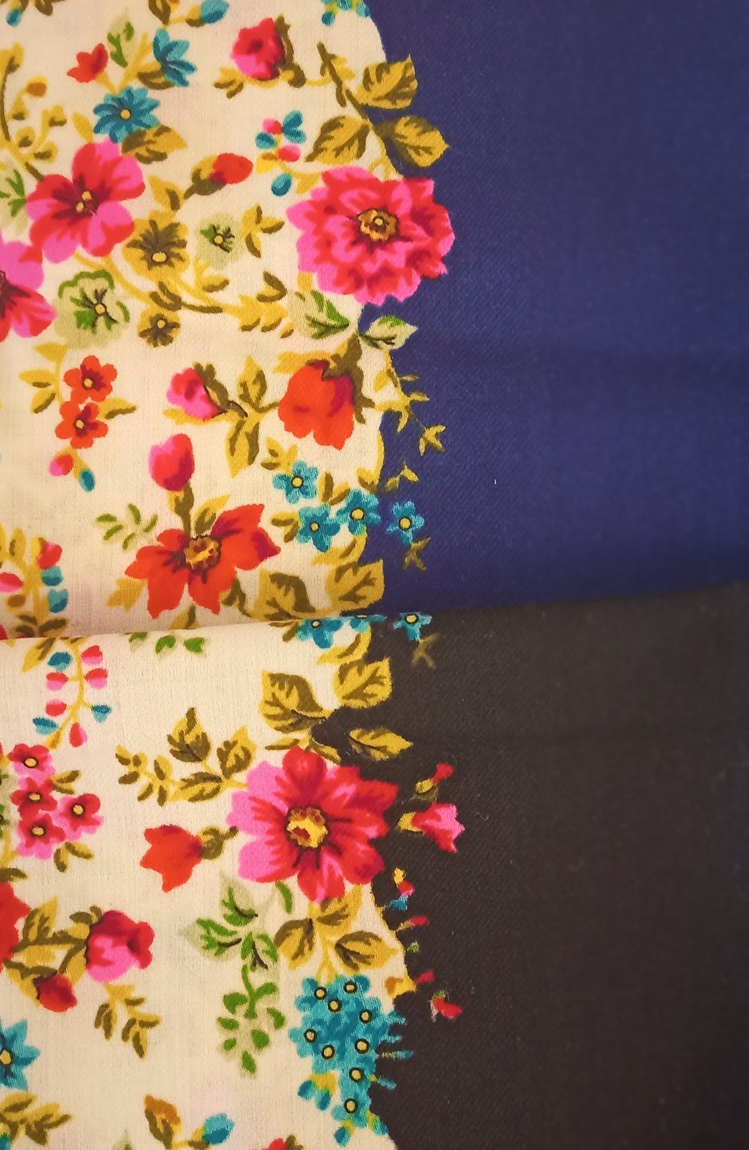 , но шаль справа выглядит как будто чуть темнее, но при этом насыщеннее и контрастнее. Голубая середина особенно.