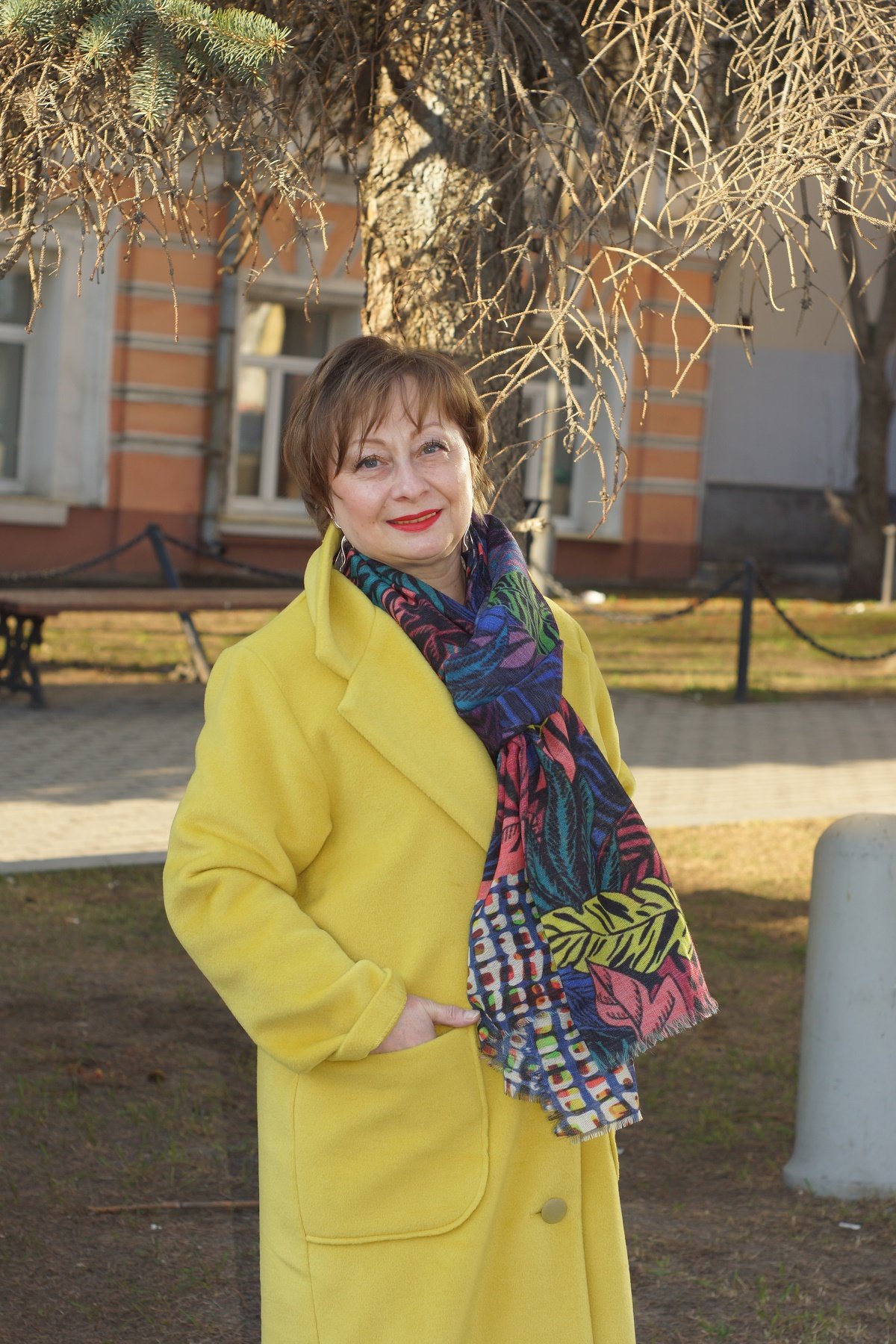 Snegir66,ах,хороша Юля,да ,к такому желтому пальто палантин как раз -и рисунок ,и цвета тоже энергичные,и вместе с тем элегантные. Городской шик.